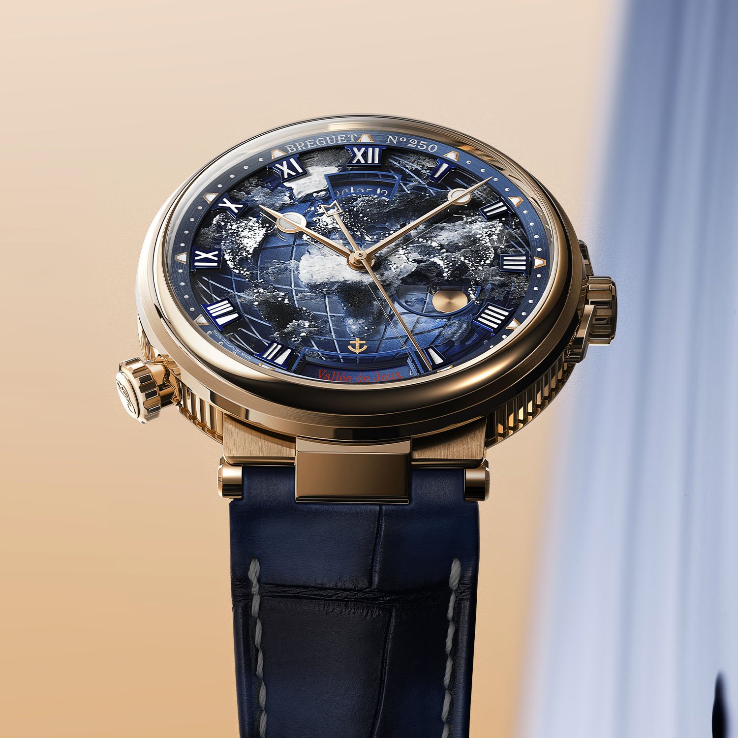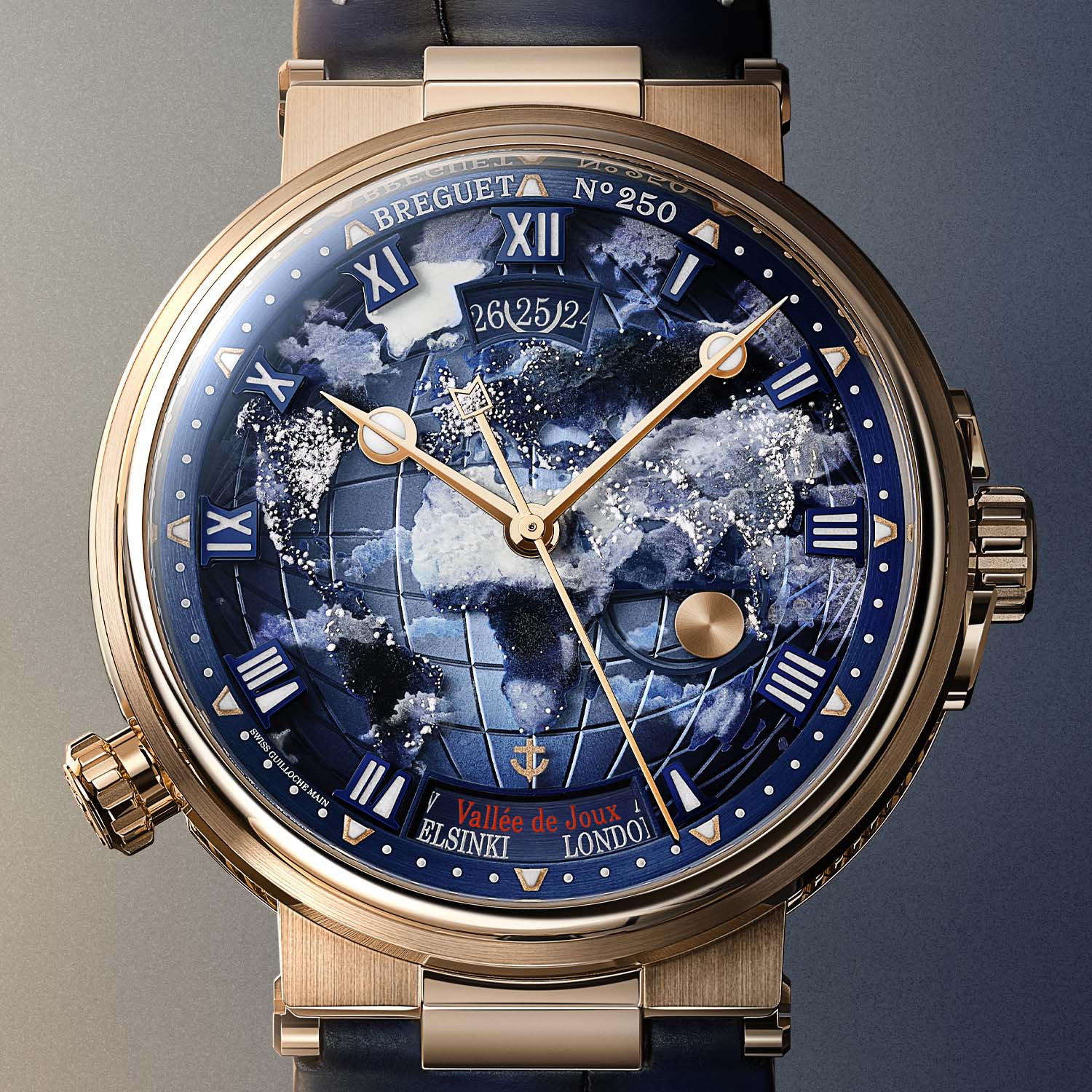 Золотой циферблат, снабженный горизонтальным градиентом от небесно-голубого в центре до тёмно-синего по периферии, украшен гильошированными вручную меридианами и параллелями, создающими оптическую иллюзию искривленной Земли. Этот ракурс известен благодаря ночному снимку нашей планеты от NASA под названием «Чёрный мрамор».