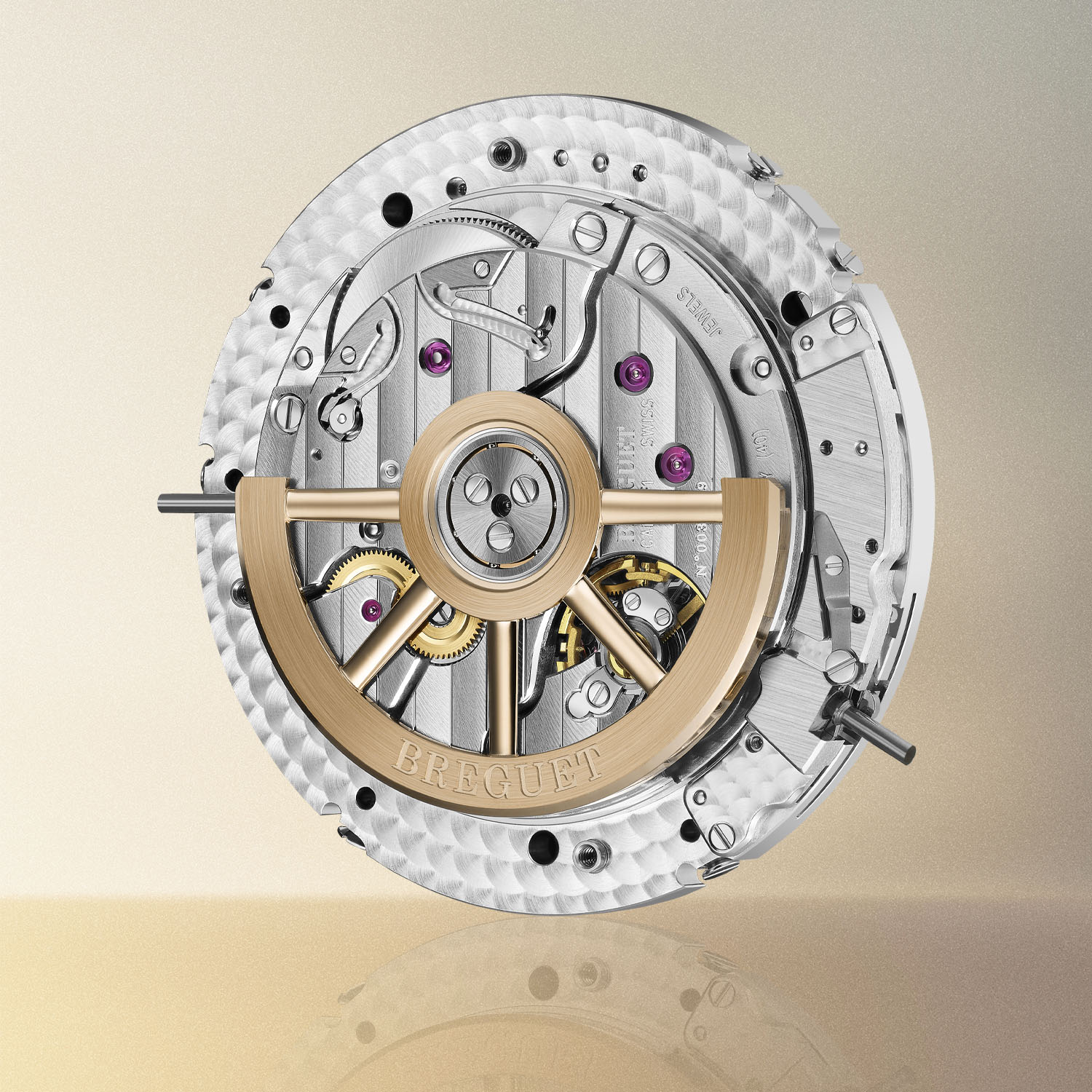 Сквозь прозрачную заднюю крышку виден мануфактурный калибр Breguet 77F1 с автоматическим подзаводом и резервом хода 55 часов. Устройство оборудовано модулем для перехода на второй часовой пояс и механическим колесом памяти с опцией программирования. Баланс работает с частотой 4 Гц, а спусковой механизм выполнен из кремния для защиты от коррозии и магнитных полей. Отделка включает узор «женевские волны» и жемчужное зернение, что соответствует традиционным стандартам высокого часового искусства Breguet.