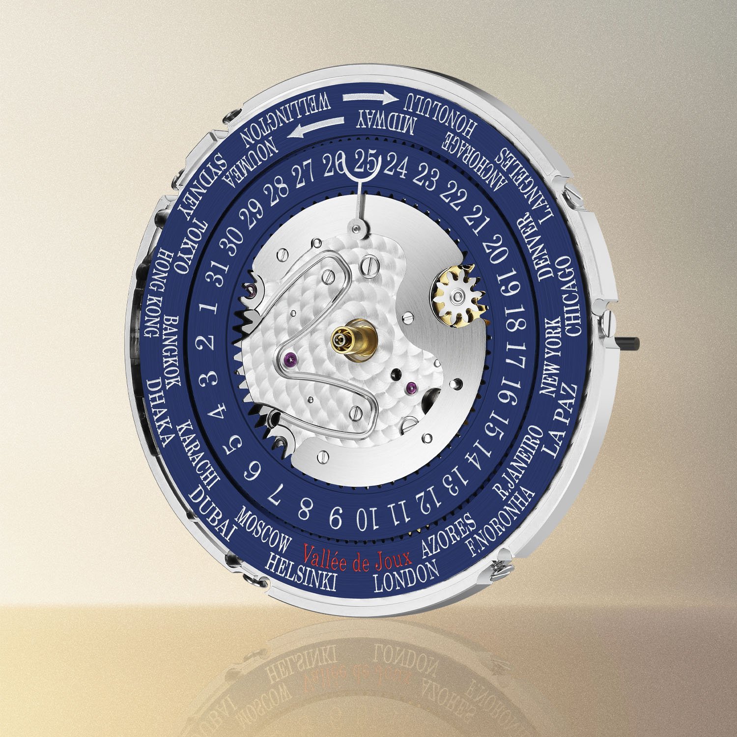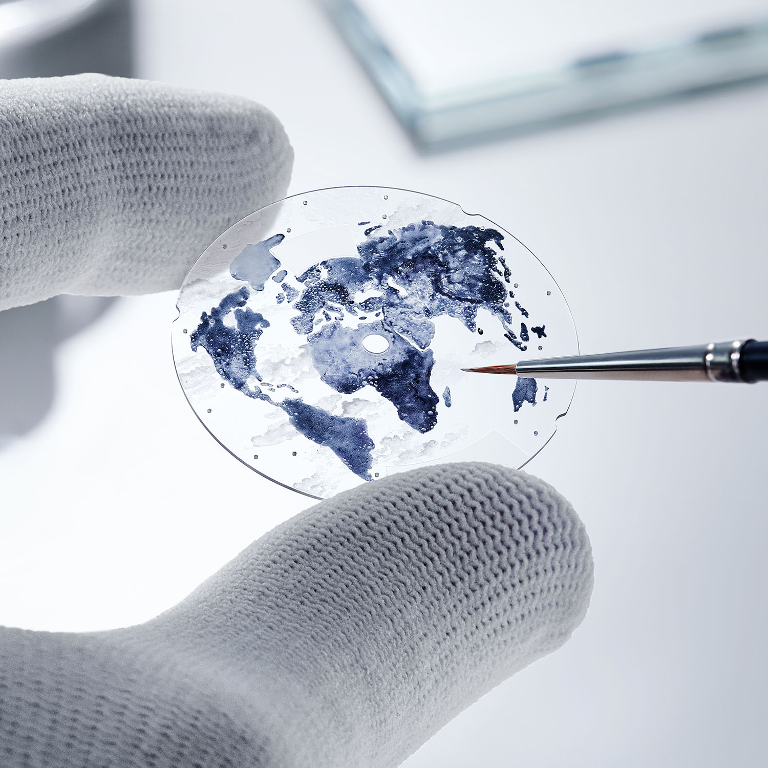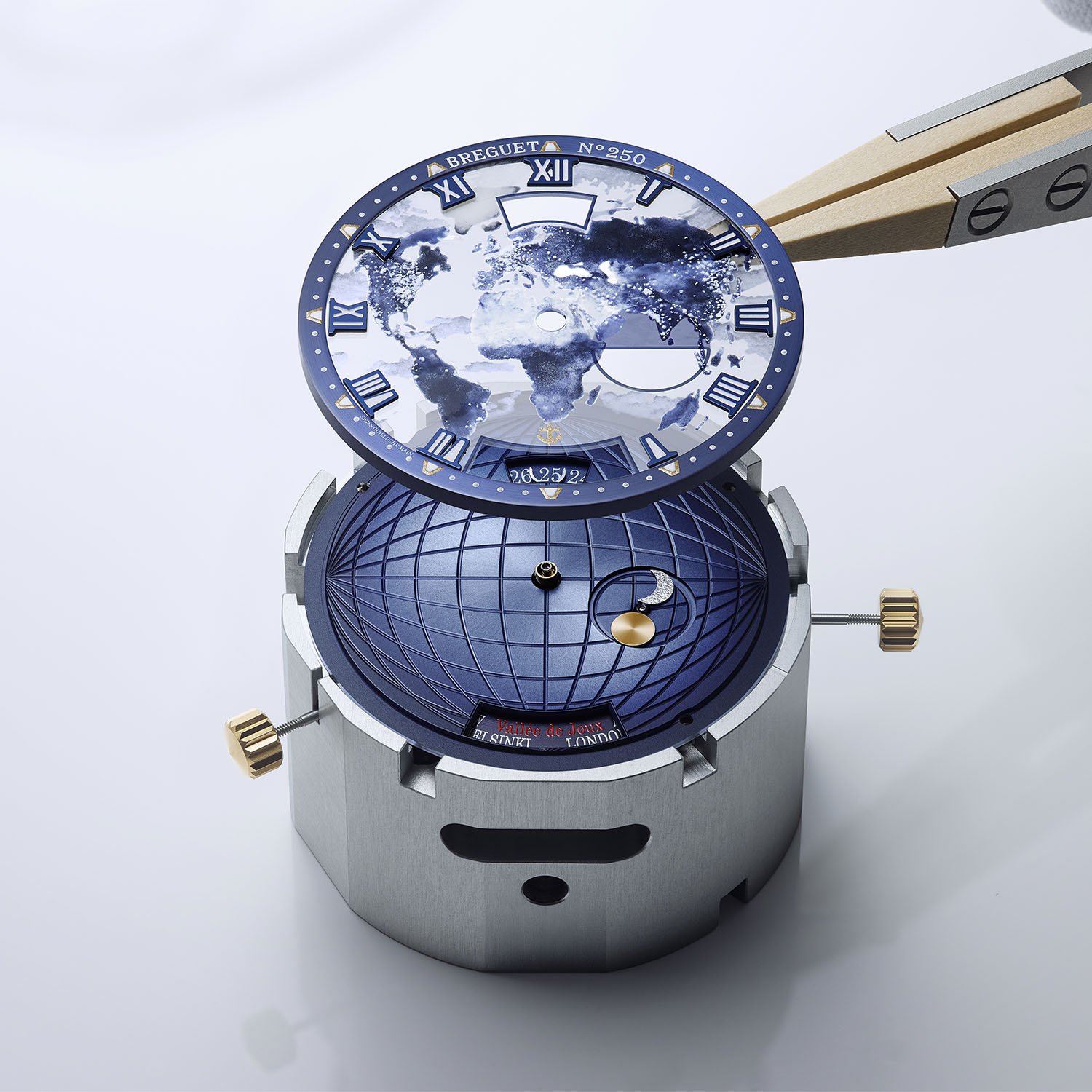 Второй циферблат, выполненный из полупрозрачного стекла из сапфира, находится над гильошированным основанием. На обороте защитного стекла миниатюрной эмалевой росписью нарисованы континенты, а их контуры, достигающие фланца, созданы в технике эмалевой тампопечати Grand Feu. Облака также вручную нарисованы эмалью снаружи стекла и обработаны в аналогичной технике.