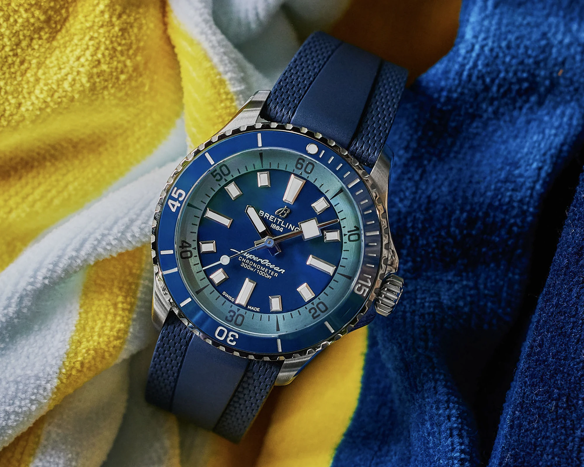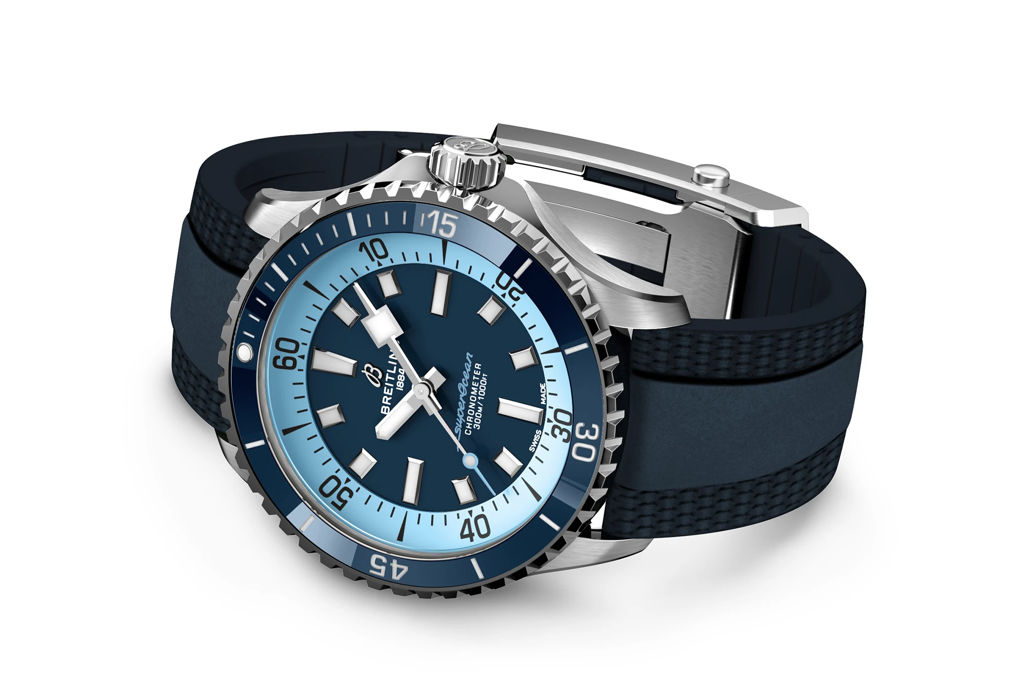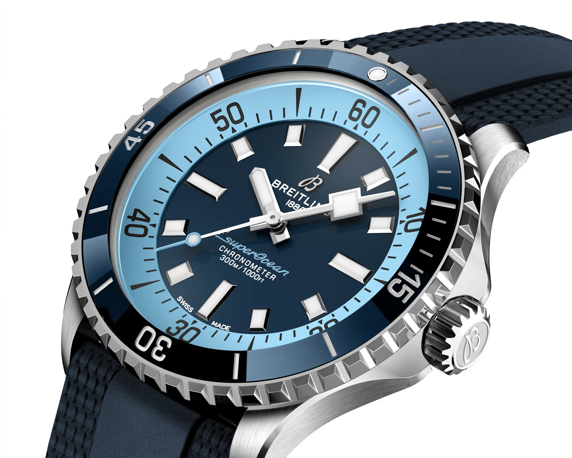 Насыщенно-синий цвет циферблата Superocean Automatic 42 символизирует цвет воды в Северном море. В сочетании с лаконичным шрифтом нанесенных на него надписей он создаёт спортивный и одновременно элегантный образ. Лазурные акценты на реверсе, минутной разметке и секундной стрелке обеспечивают контраст и напоминают о морских волнах. Широкие и угловатые часовые и минутные индексы, а также стрелки покрыты составом Super-LumiNova, что обеспечивает им превосходную читаемость даже при минимальном освещении.