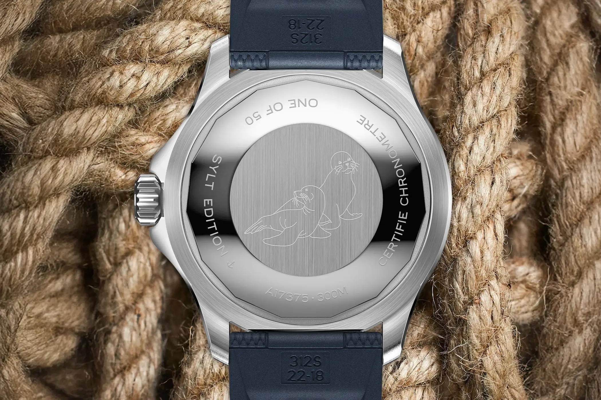 Водонепроницаемость корпуса обеспечивает завинчивающаяся головка завода с двумя специальными прокладками и такая же стальная задняя крышка. Последняя украшена гравировкой с изображением пары морских котиков, а на ее внешнем кольце размещены надписи «Sylt Edition» и «One of 50» – напоминание о лимитированном выпуске.