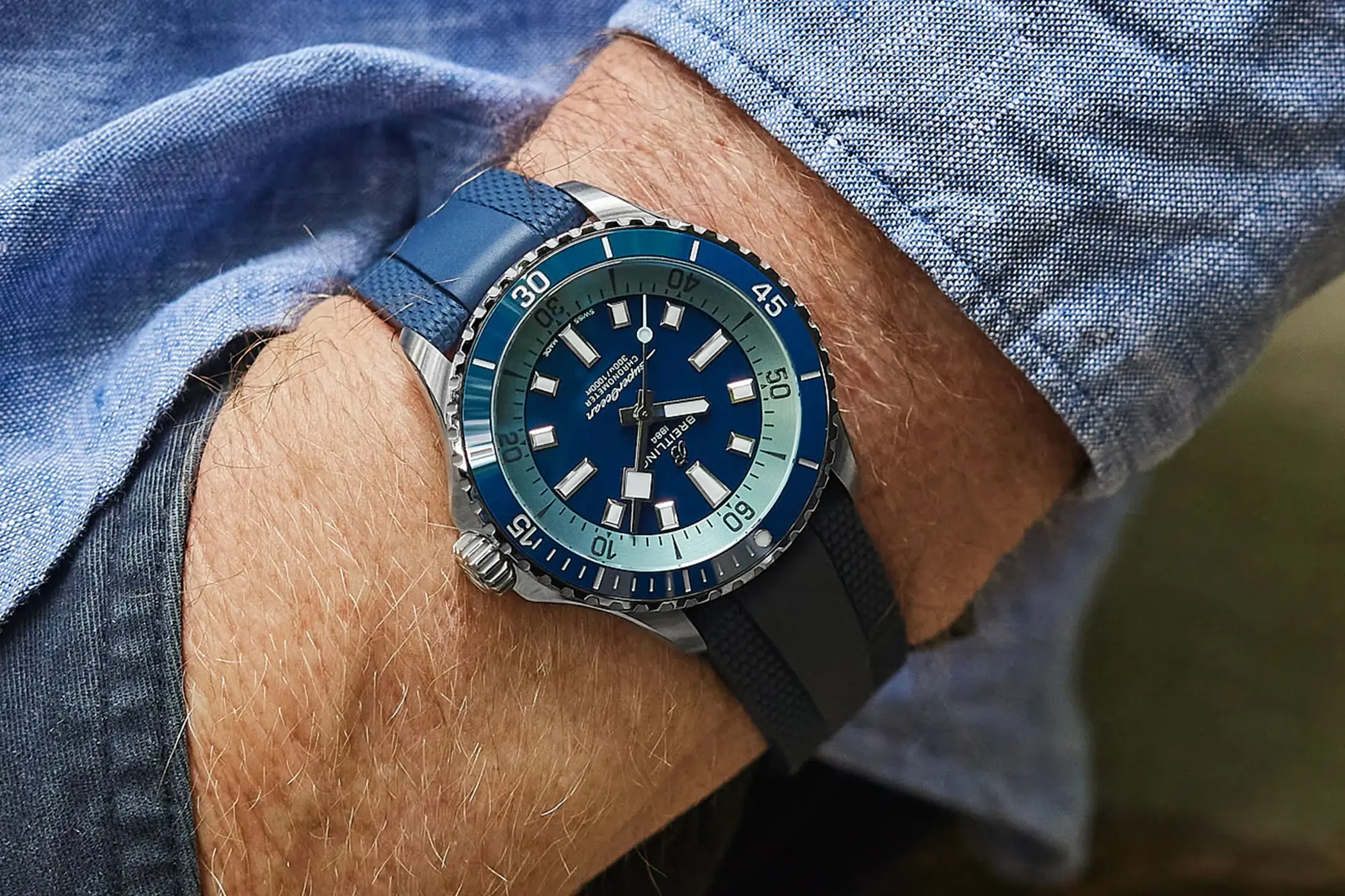 Компания Breitling в очередной раз порадовала ценителей премиальных хронометров новой моделью дайверских часов. Эксклюзивная новинка выпущена очень ограниченной партией всего в 50 экземпляров. Модель имеет 42-миллиметровый корпус с гравированной задней крышкой и стильный темно-синий циферблат с однонаправленным керамическим безелем.
