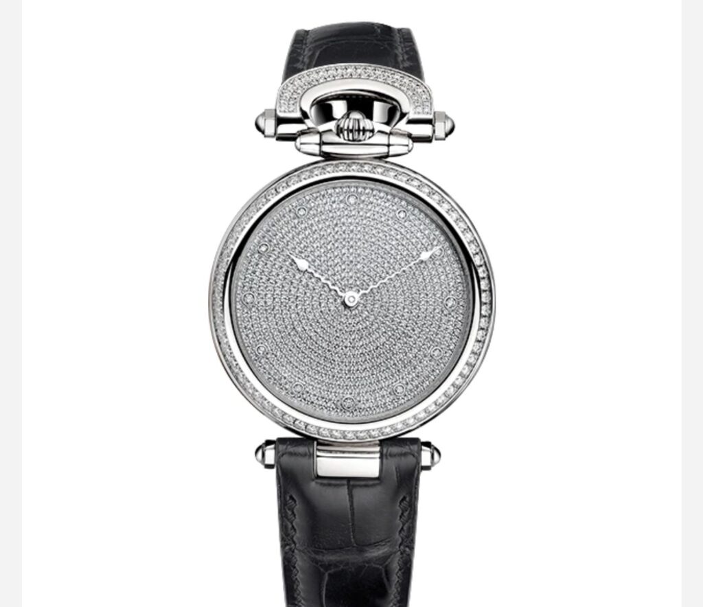 Корпус и циферблат инкрустированы фабричными белыми природными бриллиантами