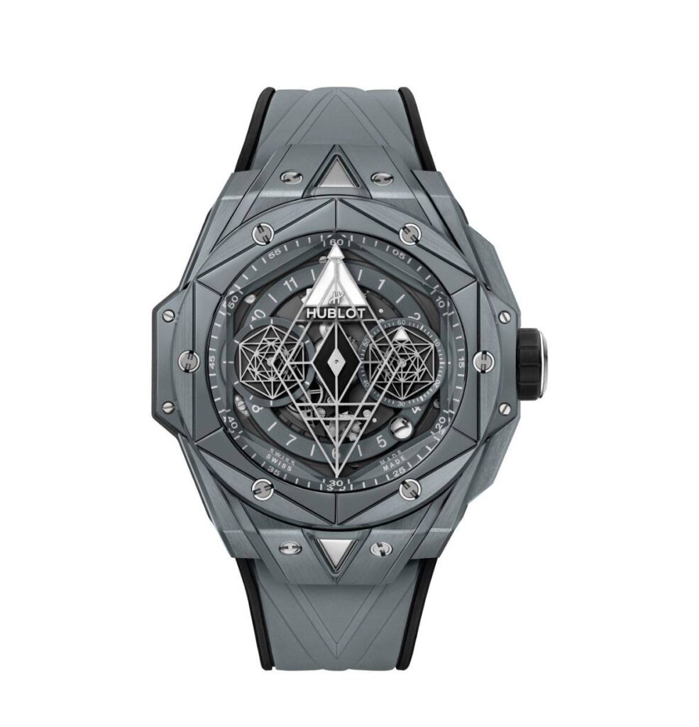 Hublot – большие любители экспериментировать с различными инновационными материалами. Женевский часовой дом одним из первых увидел высокий потенциал керамики в производстве часовых корпусов ввиду его устойчивости к появлению царапин. Со временем, используя различные сочетания материалов, при термической обработке у инженеров Убло стало получаться выделять различные цвета. Одним из результатов экспериментов Hublot стал серый цвет, который швейцарцы и используют при изготовлении Big Bang Sang Bleu II Grey Ceramic 45 mm 418.FX.8007.RX.MXM21. Коллаборация с французами из Sang Bleu вышла очень современной, запоминающейся и технологичной. Сердцем 45-миллиметрового хронографа является мануфактурный механизм HUB1240 Unico с колонным колесом и трехдневным запасом хода. Завод – автоматический. В небольшой апертуре на циферблате между 4 и 5 часами отображается дата. Компания объявила о том, что будет выпущено всего 200 экземпляров в этом цвете. Новинка 2021.