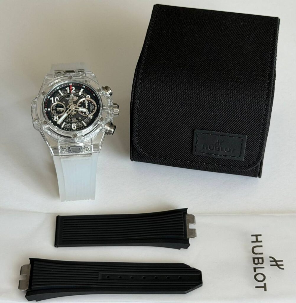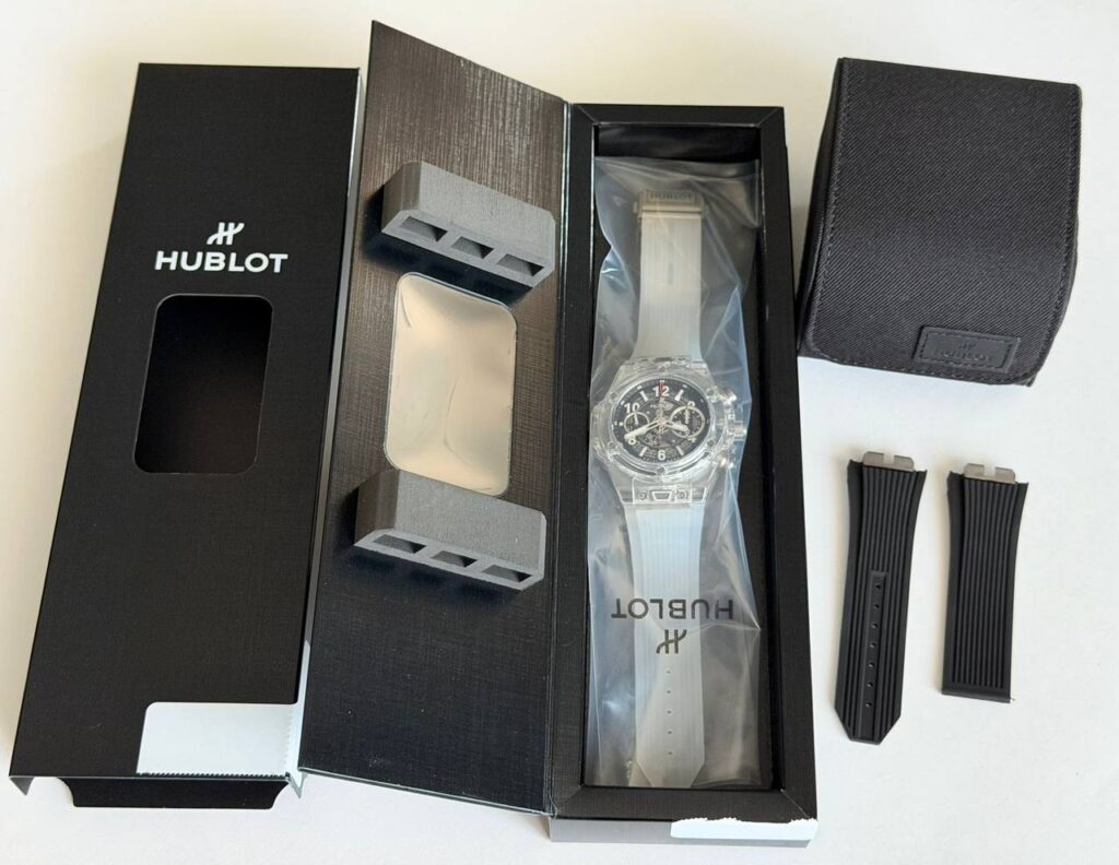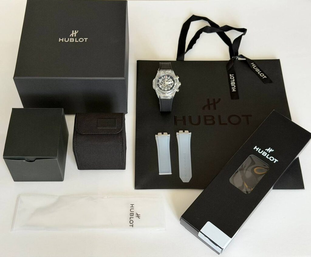 Полнейший комплект коробок и документов с транспортной переноской из магазина и классической переноской Хубло и оригинальным пакетом Hublot.