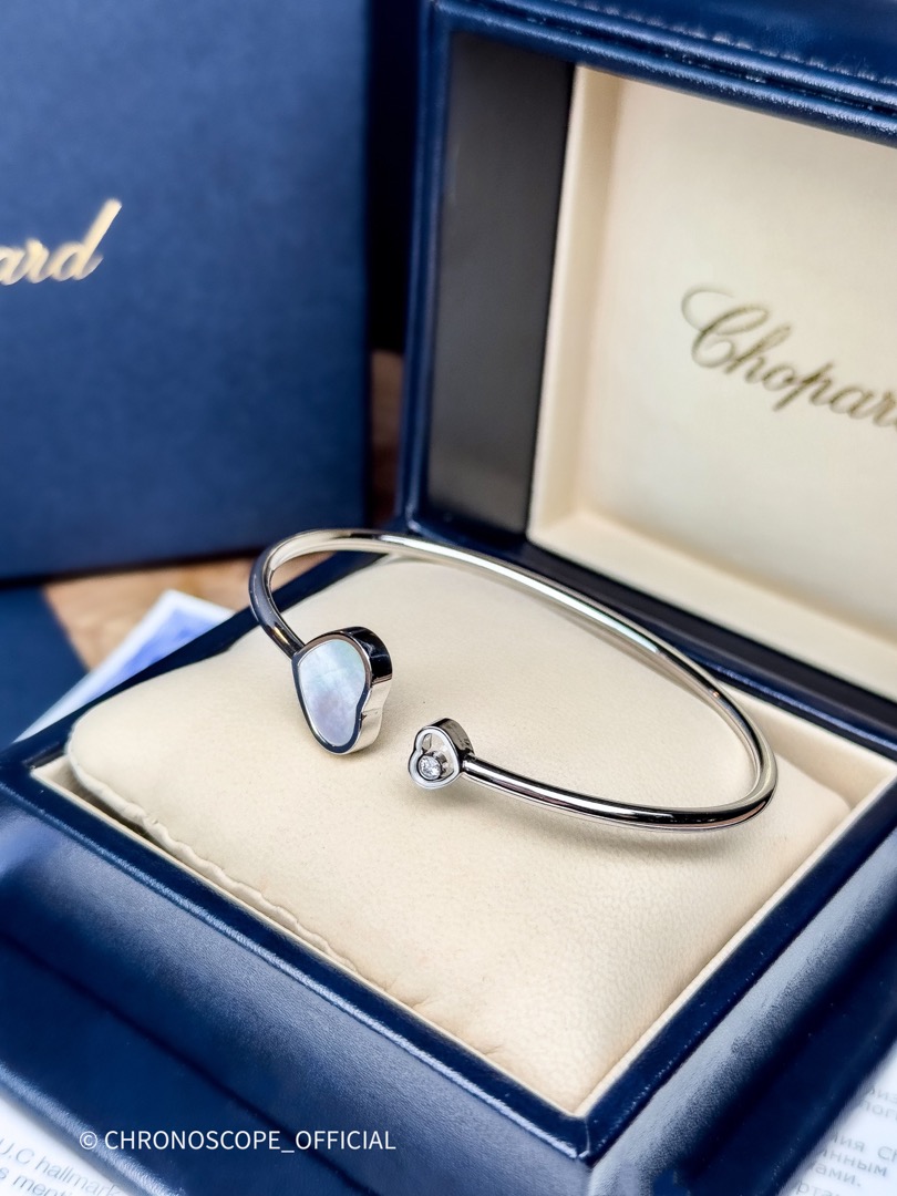 - Браслет Chopard Happy Hearts, выполненный из белоснежного золота 750 пробы, – это ода утонченности и чистоте линий. В его холодной, благородной палитре расцветает нежный перламутр, создавая неповторимый контраст, притягивающий взгляд и завораживающий своей элегантностью.