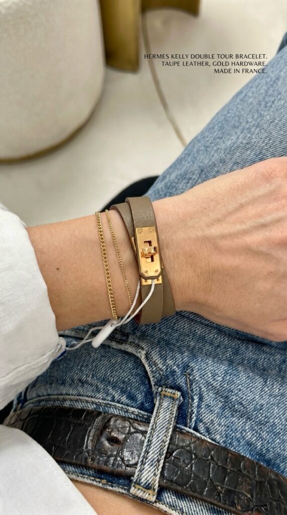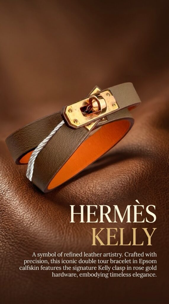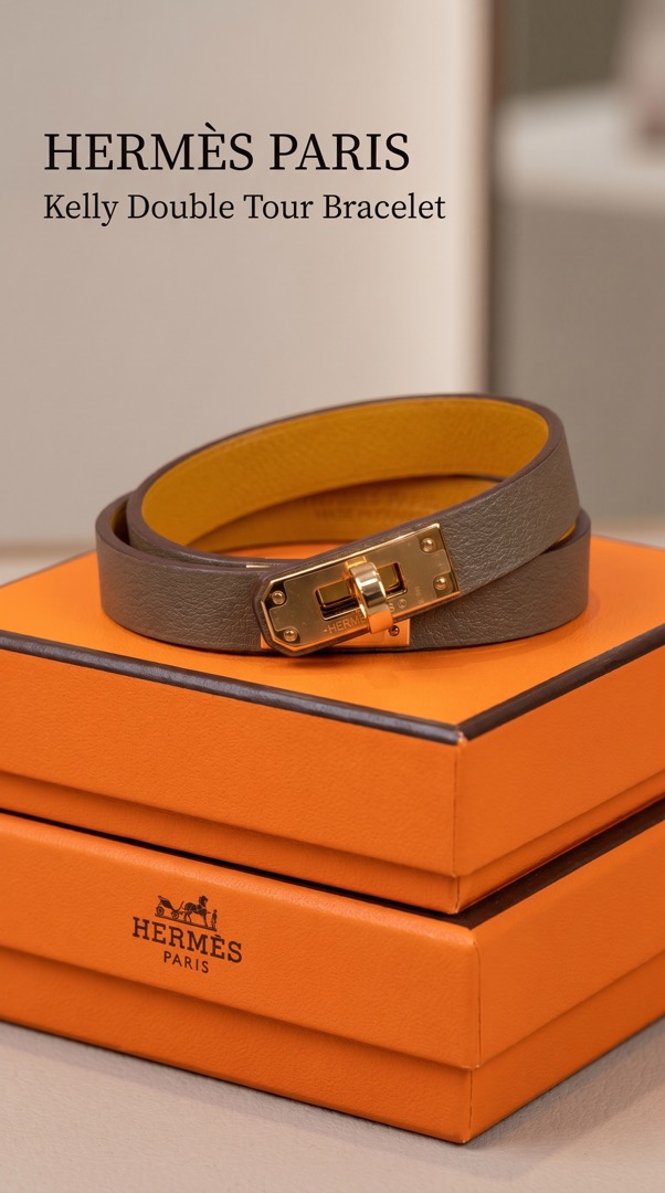 - Браслет выполнен в эстетике культовой линии Hermès с фирменной поворотной застёжкой Kelly — элементом, вдохновлённым замками легендарных сумок бренда. Дизайн сочетает минимализм и архитектурную чёткость форм, подчеркивая статус и утончённый вкус владельца.