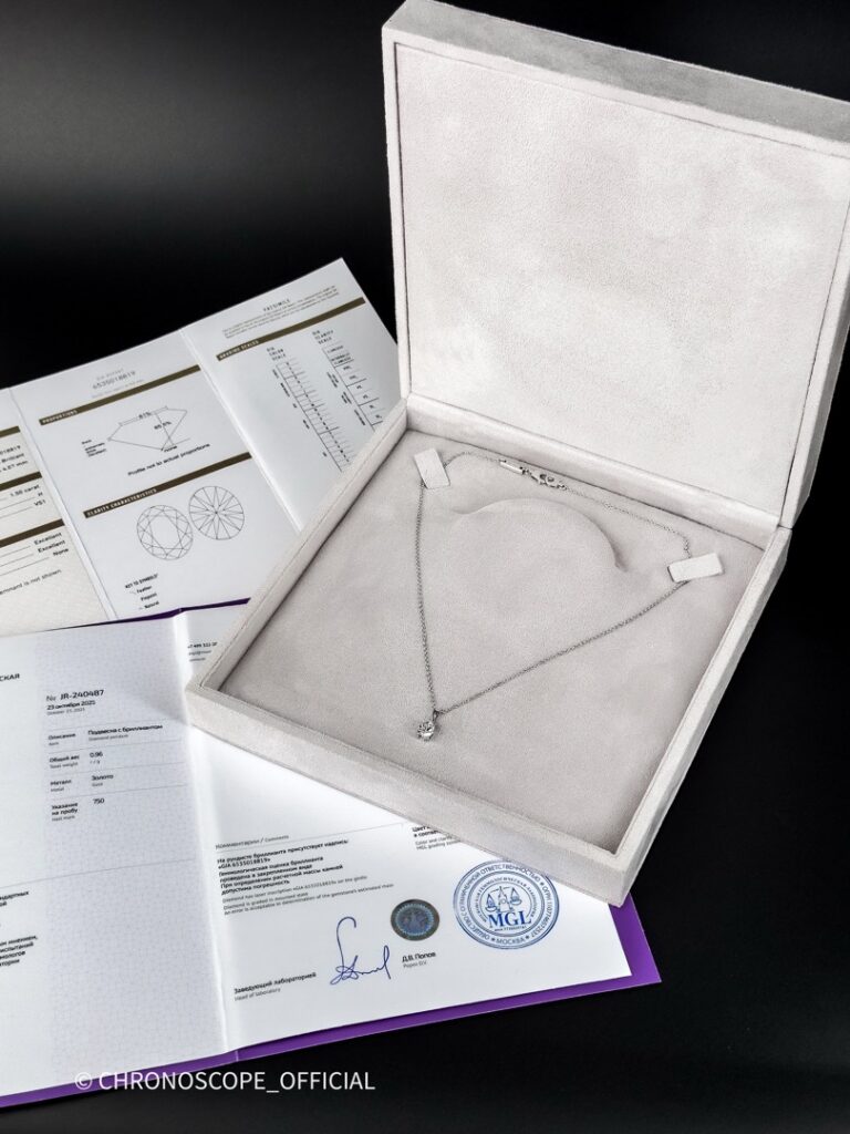 - Подлинность и высочайшее качество бриллианта подтверждены сертификатами МГЛ и GIA – ведущих геммологических лабораторий мира.