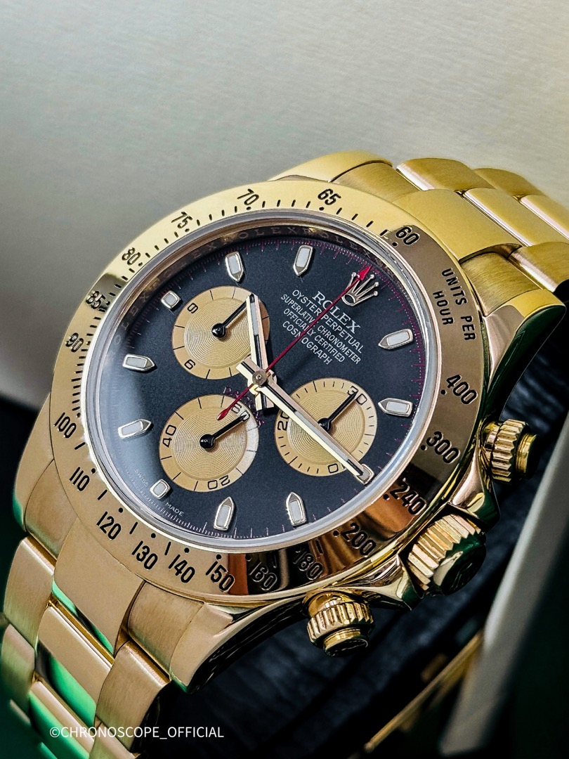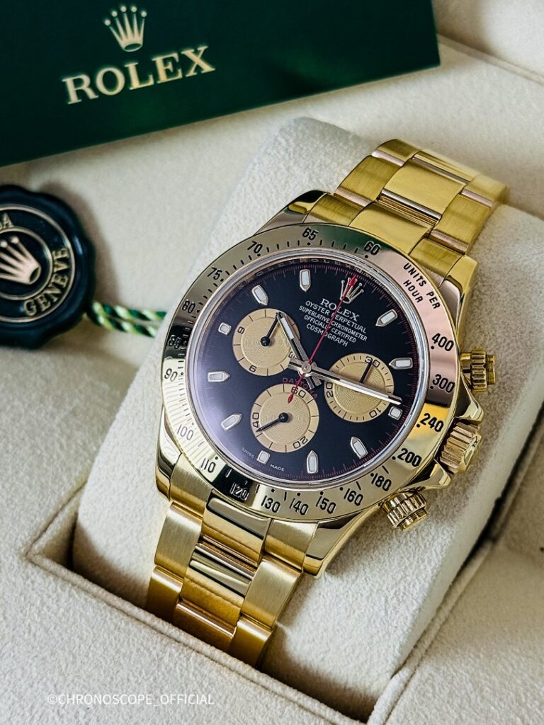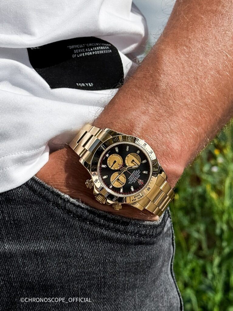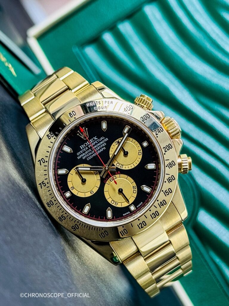 Статусность и культовость данных часов уже давно является аксиомой. Самая известная Daytona Paul Newman в цельном золотом корпусе, привинчиваемые задняя крышка и заводная головка, фиксированный безель с тахиметрической шкалой, браслет и пряжка, все это выполнено из 18-каратного желтого золота.