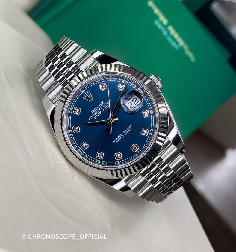 Rolex Datejust 41 с референсом 126334 – это сочетание классики и блеска, которое подчеркивает статус и вкус владельца. Его главная особенность – роскошный синий циферблат с бриллиантовыми метками, придающий часам неповторимую элегантность.