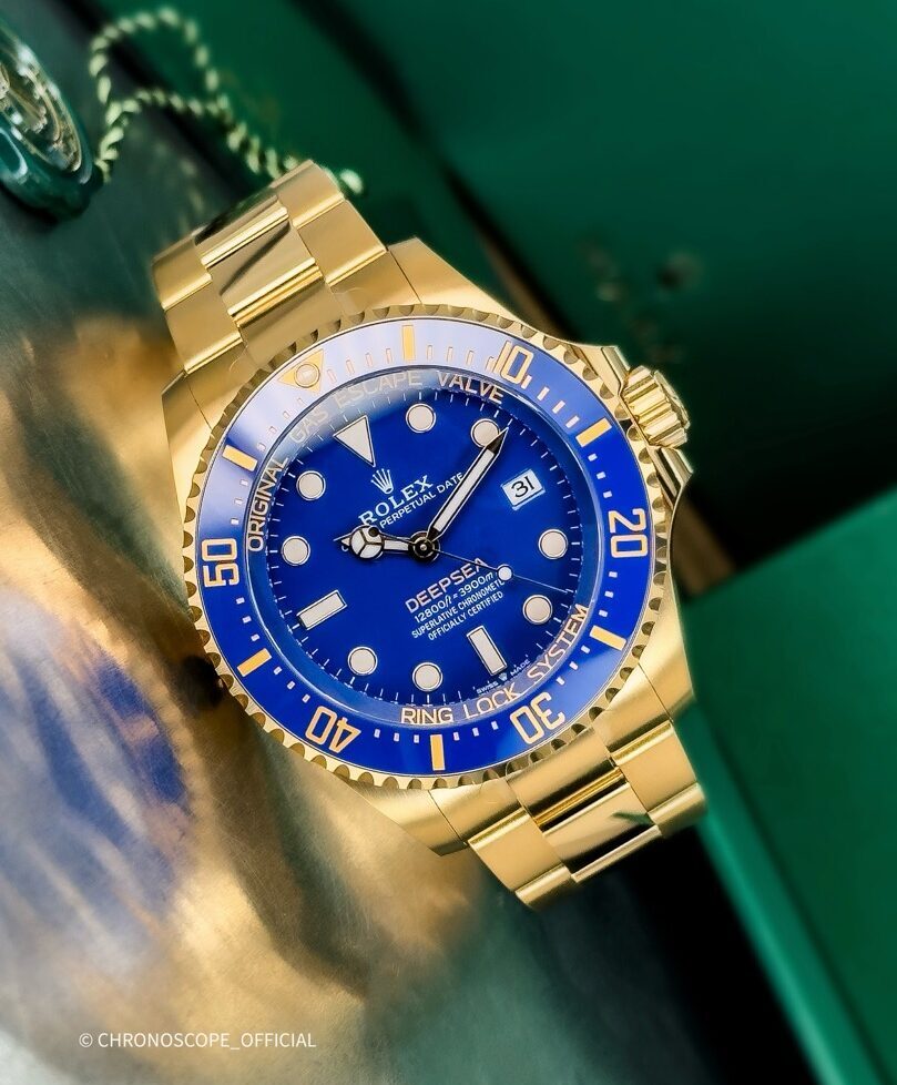 Синий лаковый циферблат с надписью ‘DEEPSEA’ пудрово-желтого цвета