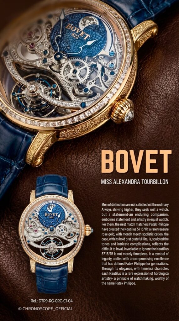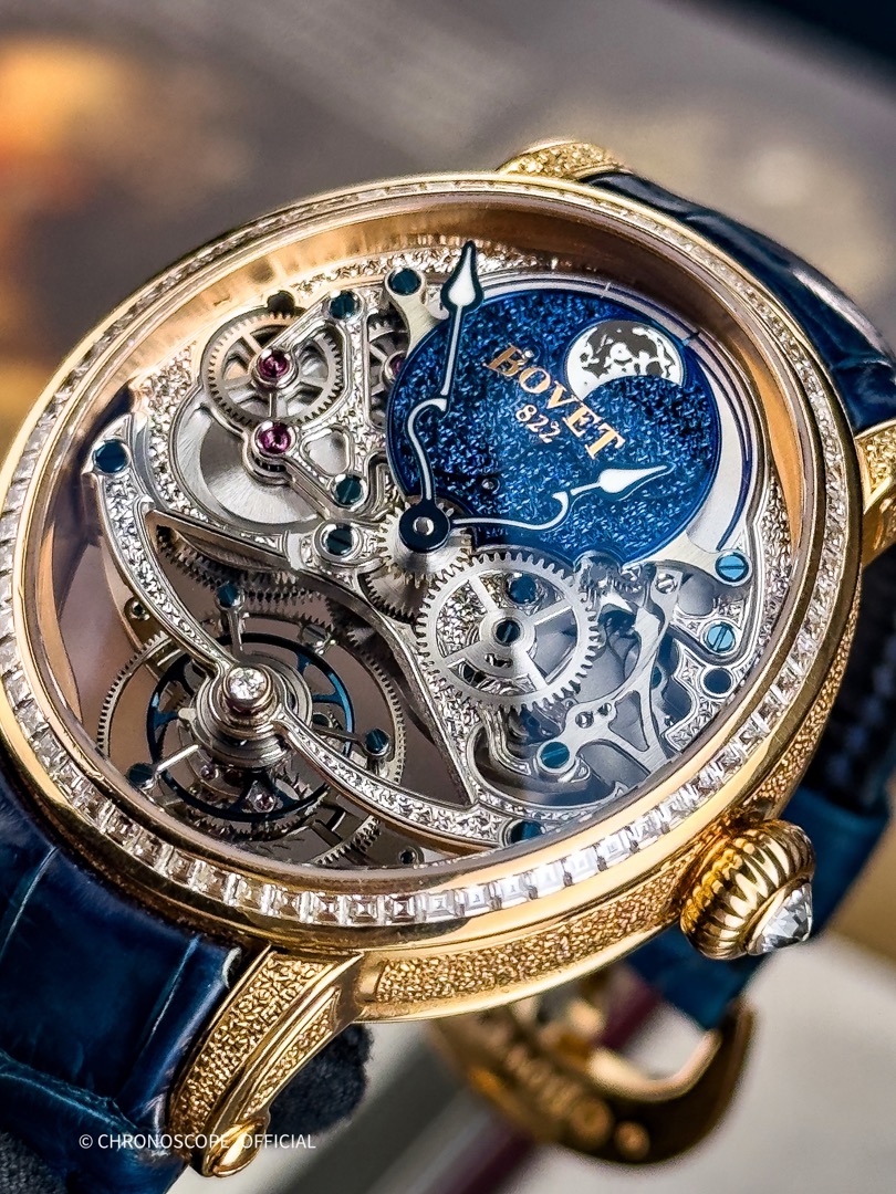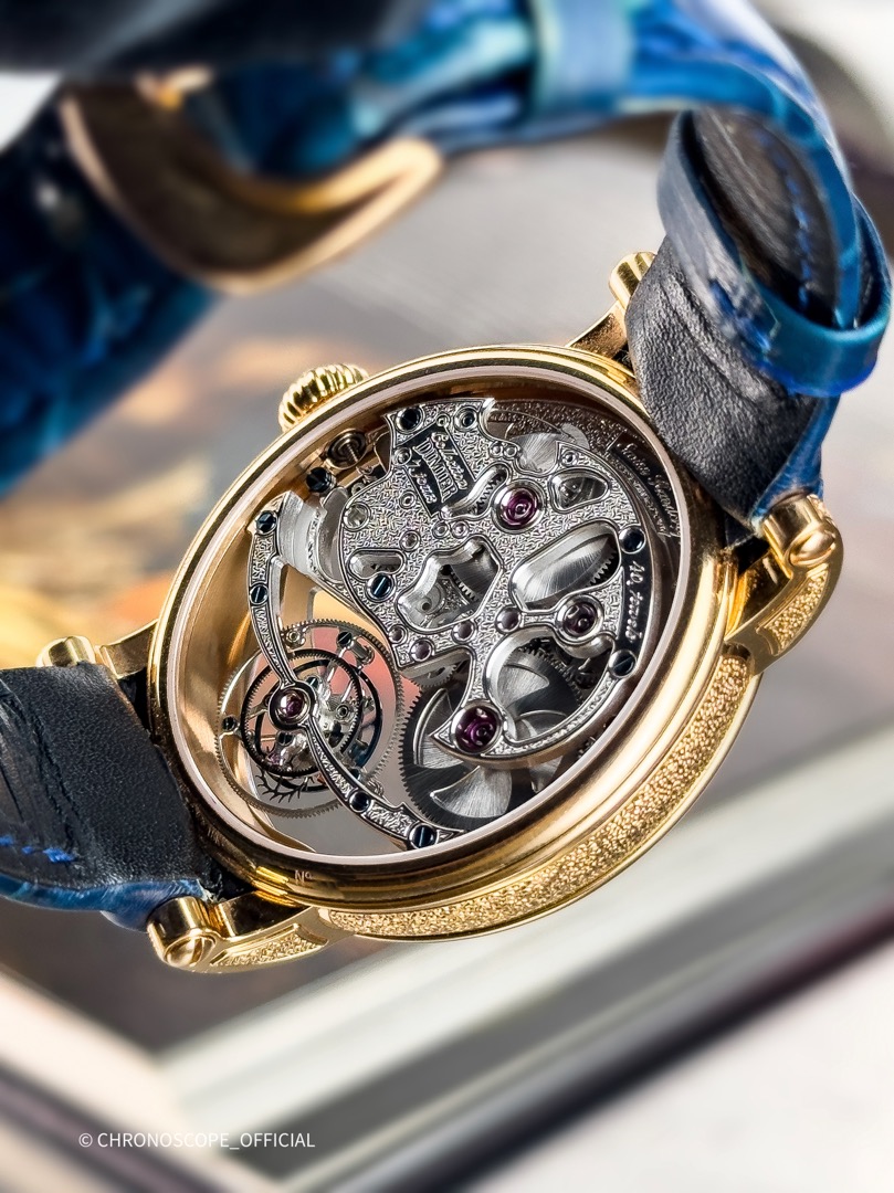 Первые часы от дома Bovet , имеющими овальную форму. Пропорции корпуса гарантируют оптимальный комфорт ношения и подчеркивают красоту женского запястья. Корпус в форме яйца из драгоценного металла с опциональными бриллиантами, скелетонизированный и украшенный механизм — просто сногсшибательно. Логотип Bovet на задней части сапфирового стекла выглядит изысканно и очень красиво на фоне «небесно»-голубой области вокруг луны. Ниже вы увидите парящий турбийон, закреплённый только на мосту.