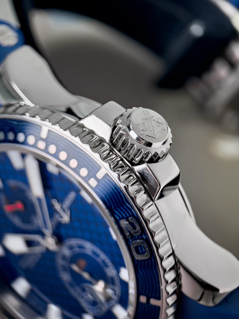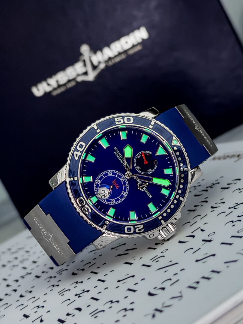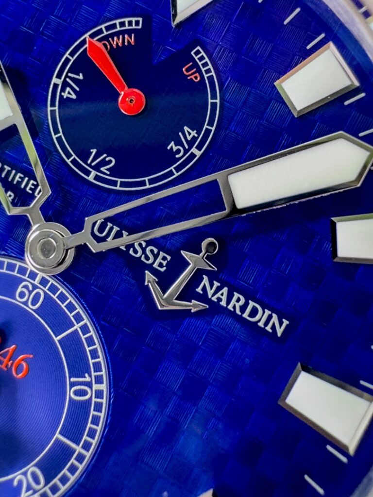 Отличные лимитированные часы для ценителей марки Ulysse Nardin! У них превосходный, глубокий синий циферблат с индикатором запаса хода, вынесенным дополнительным секундным циферблатом и окошком даты. Стрелки и часовые метки люминисцированы. Модель выполнена из белого золота 750*