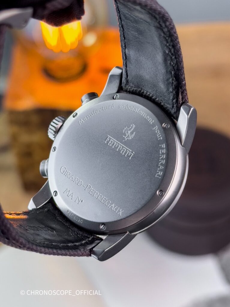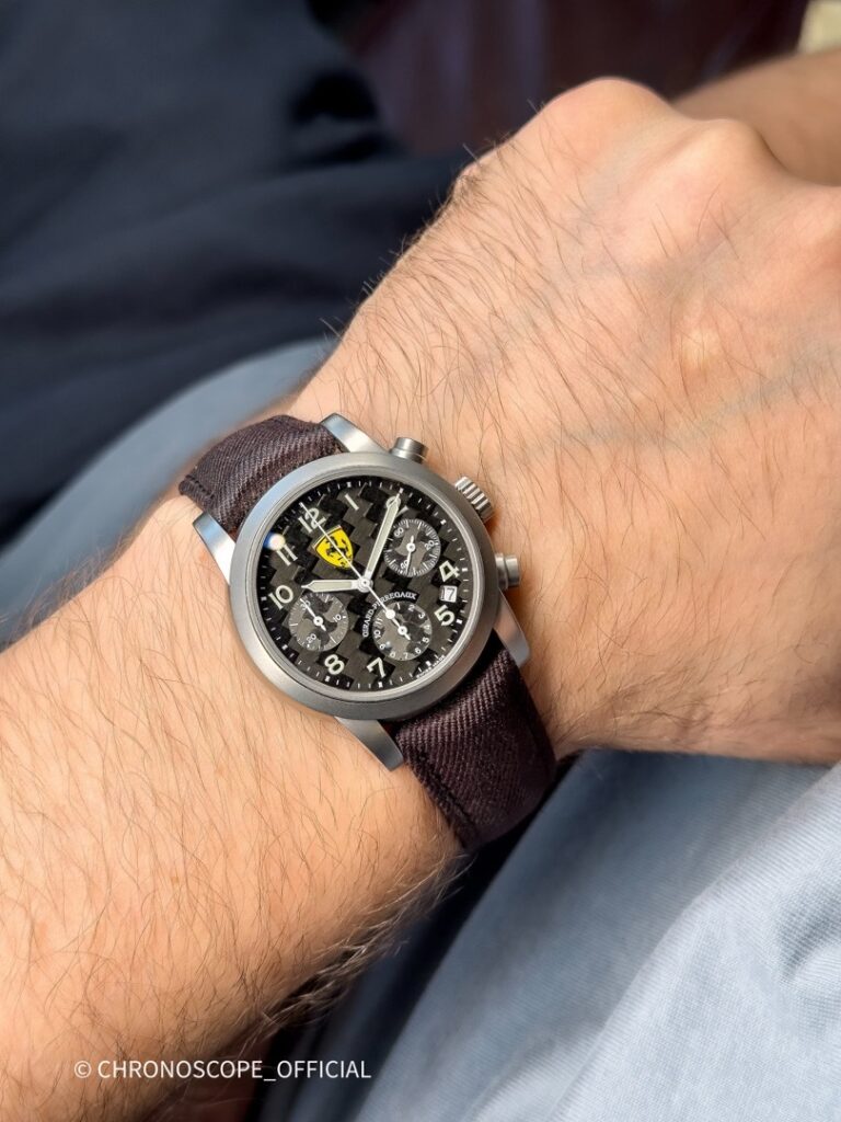 Эффектный карбоновый циферблат подчеркивает связь с миром автоспорта.