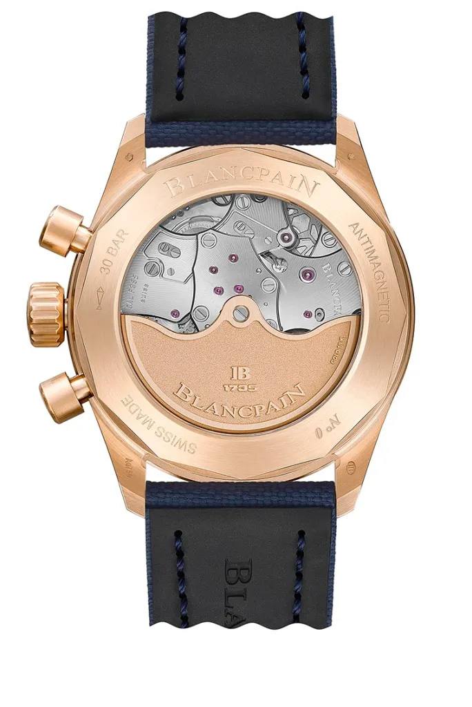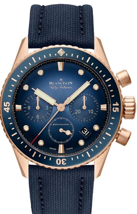 В 2022 году Blancpain выпускает новый Fifty Fathoms Bathyscaphe Flyback Chronograph 43mm 5200-3640-O52 в розовом золоте с синим циферблатом.