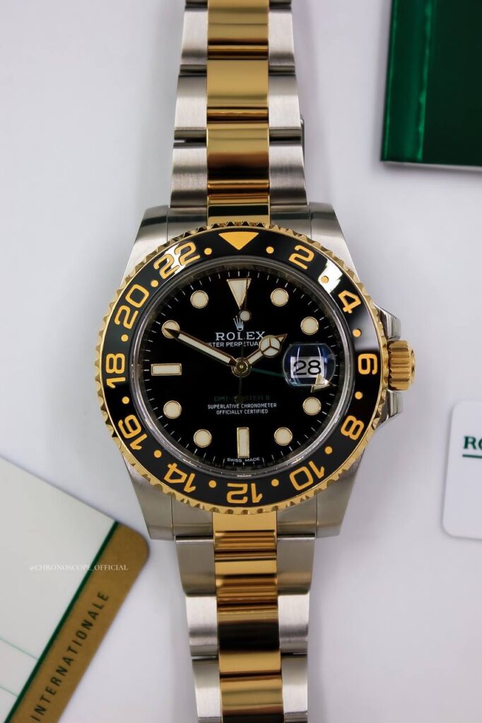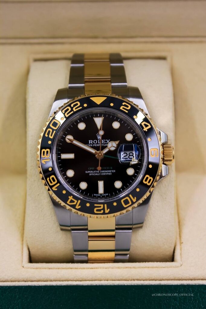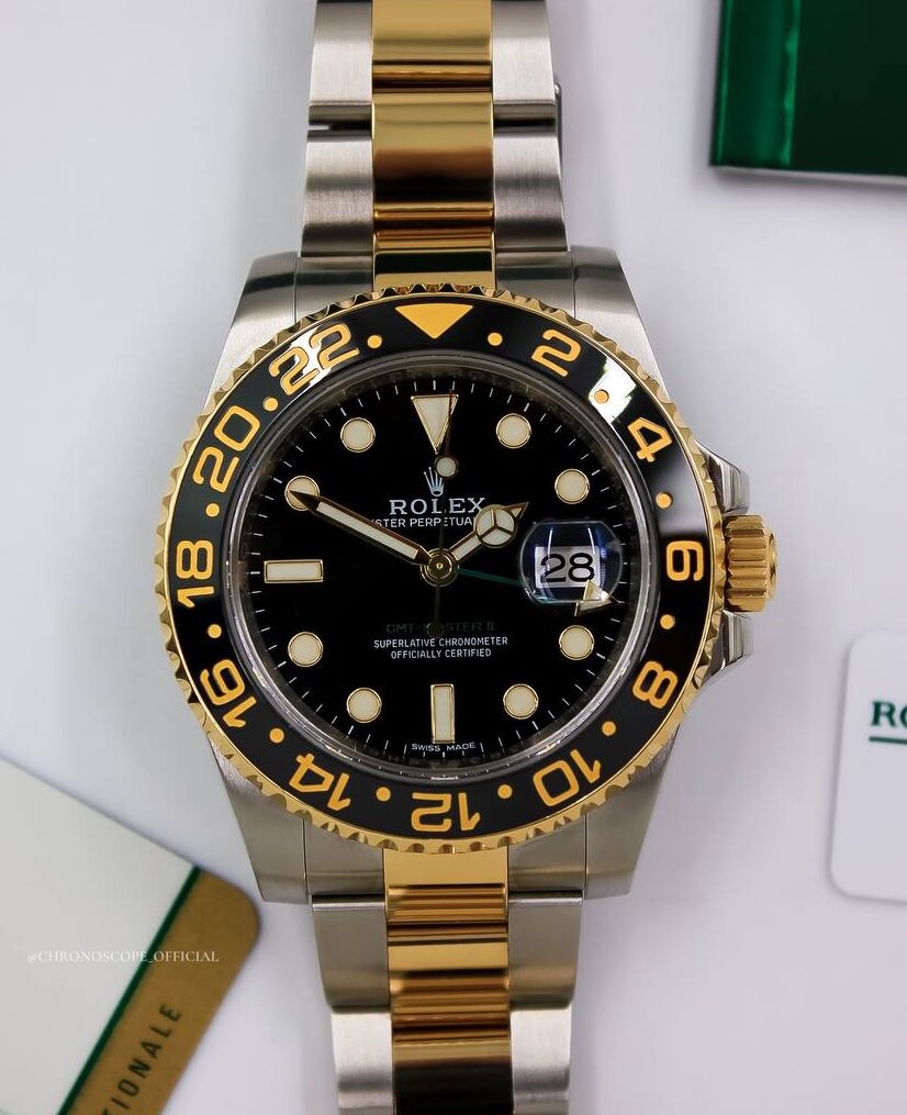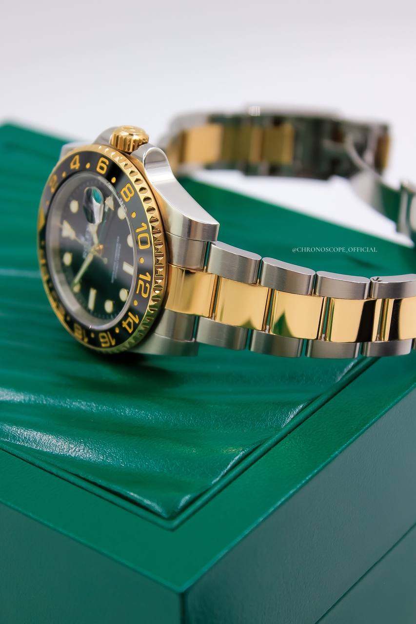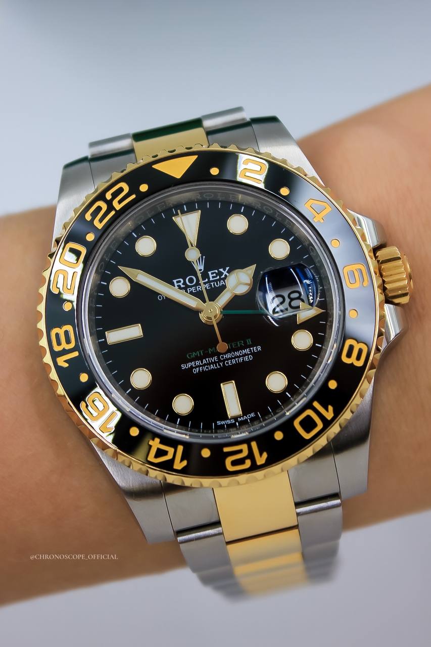 Идеальное решение для просмотра второго времени с зеленой стрелкой, модель GMT Master от компании Rolex великолепна в биколорном исполнении. Представленные в 1955 году часы GMT-Master были разработаны для пилотов международных авиалиний. Модель GMT-Master II нового поколения, анонсированная в 2005 году, оказалась еще более незаменимой для людей, чья профессиональная деятельность связана с дальними путешествиями