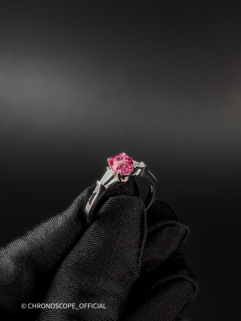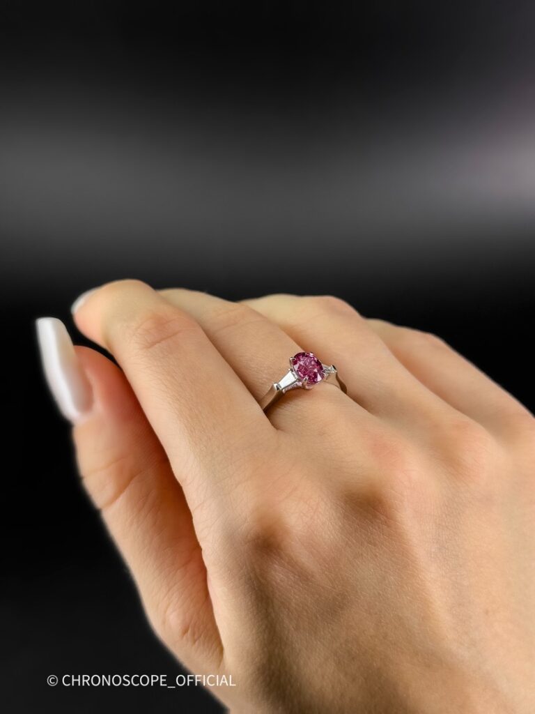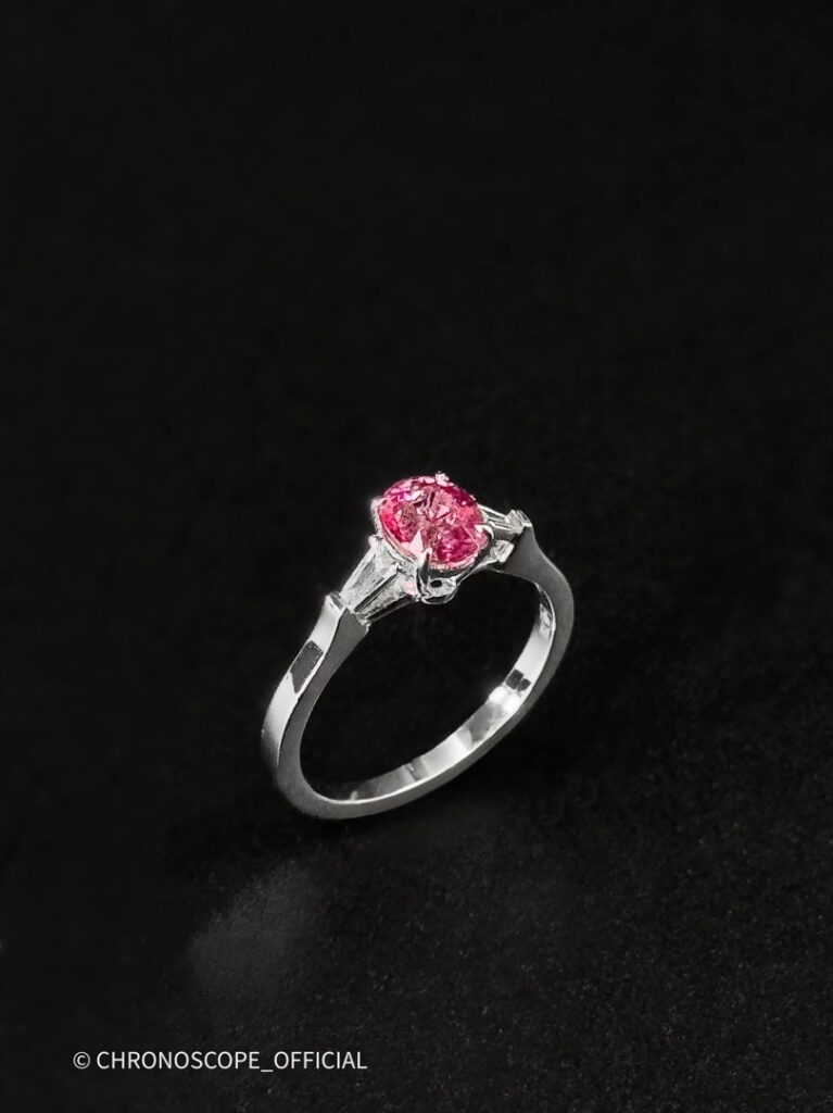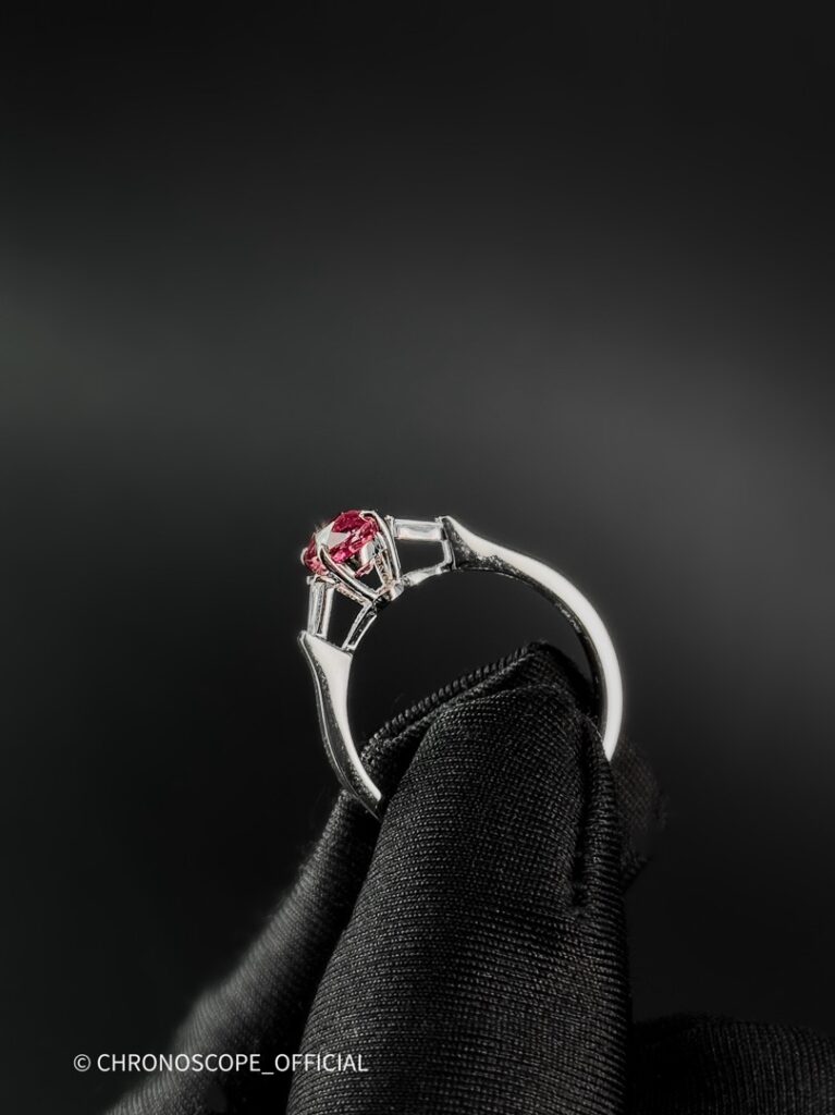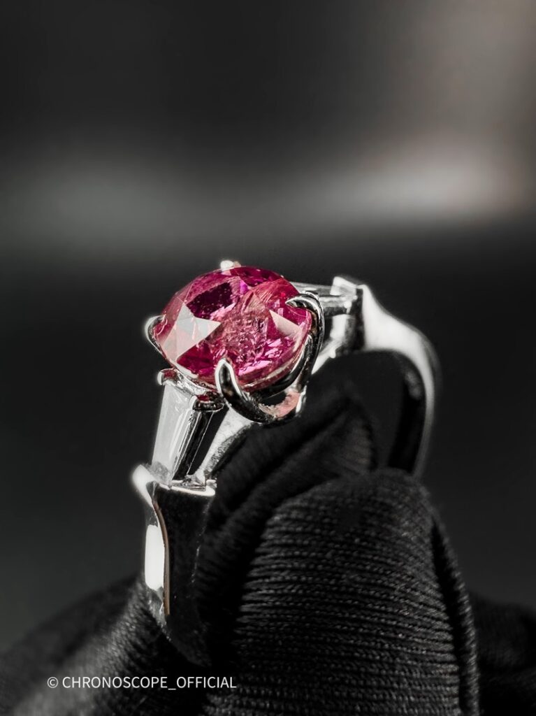 - Центральным элементом этого украшения является природный сапфир, обладающий редким и завораживающим цветом — ярко-фиолетово-красным. Его глубокий оттенок, словно бархат ночного неба, притягивает взгляд и дарит ощущение утонченности.