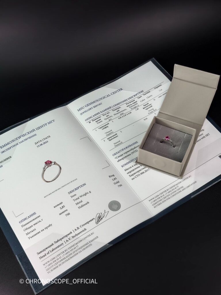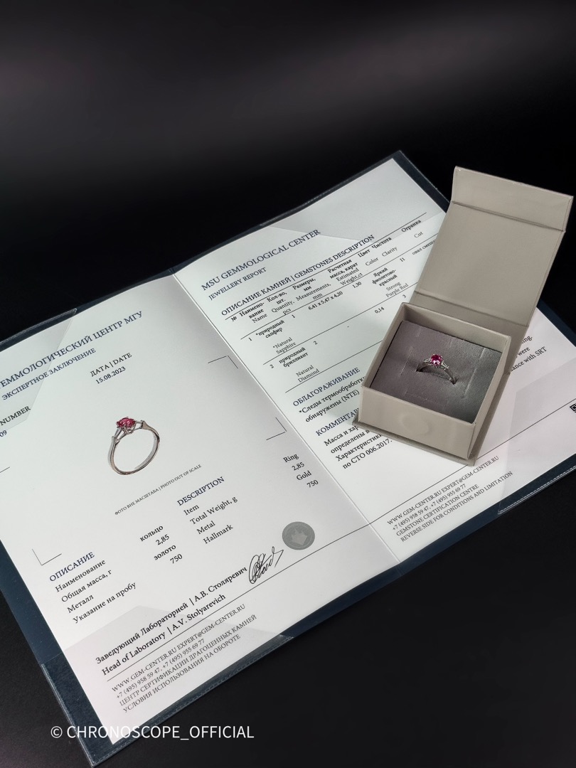 - Подлинность и характеристики сапфира и бриллиантов подтверждены сертификатом геммологического центра МГУ, что гарантирует их природное происхождение и соответствие заявленным параметрам.