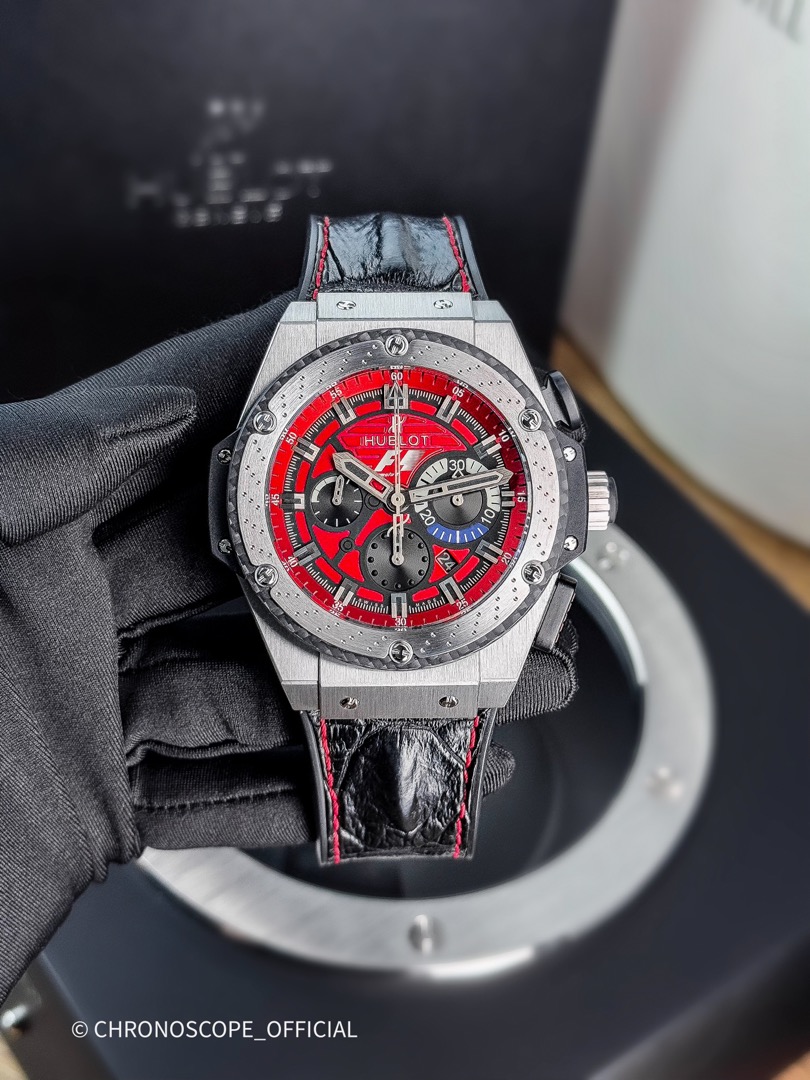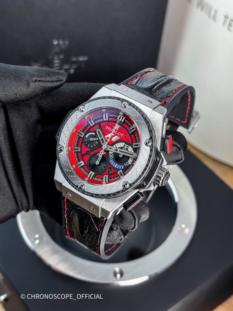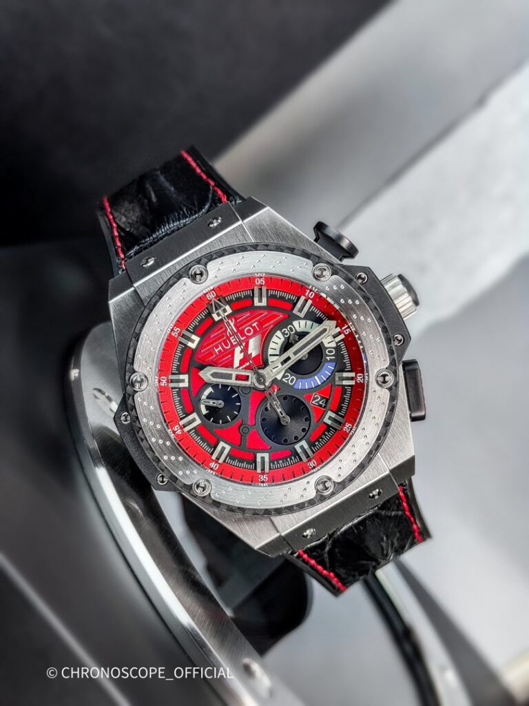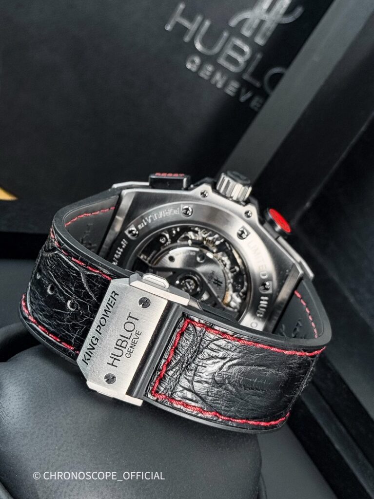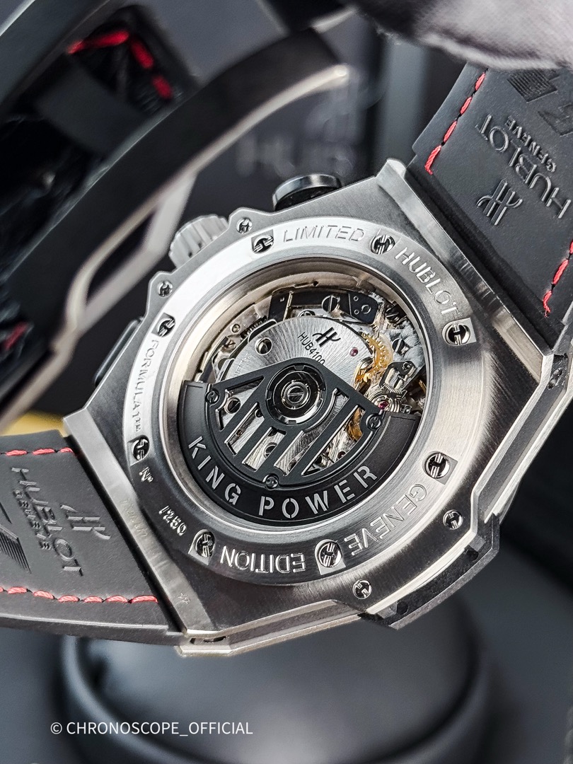 Лимитированная модель F1 King Power Austin от швейцарской часовой компании Hublot посвящена Гран-при Формулы 1. Корпус изготовлен из сатинированного титана, диаметром 48 мм. Фиксированный безель, выполненный в стиле высокотехнологичного тормозного диска, на шести винтах. Боковые вставки из черного композитного материала. Защищенная заводная головка, с логотипом бренда на ее торце, расположена на 3 часах. Хронографические кнопки с красными резиновыми вставками — на 2 и 4 часах