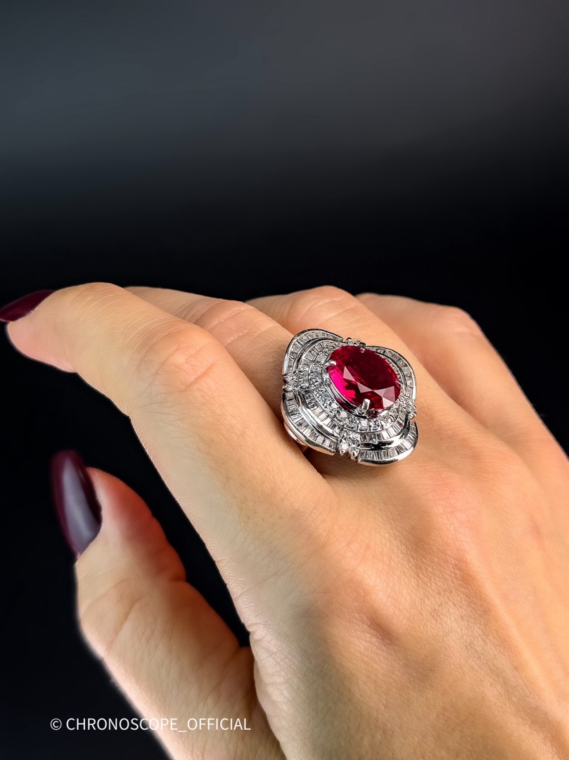 - Центральным элементом этого великолепия является рубин весом 4.69 карат. Его насыщенный, глубокий алый цвет напоминает о жарком пламени, бьющемся в самом сердце земли.