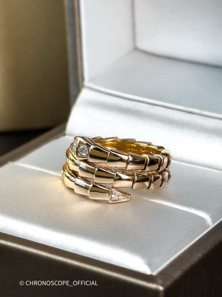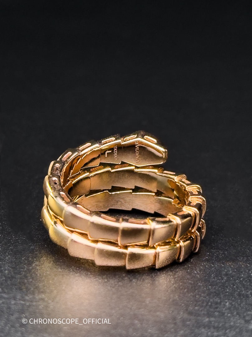 - Кольцо Serpenti Viper из розового золота 18 карат с фрагментами бриллиантового паве – исключительная интерпретация символа безграничных метаморфоз Bvlgari, привлекающая внимание знаковой гармонией чистой эстетики, обволакивающих форм и харизматичной притягательности.