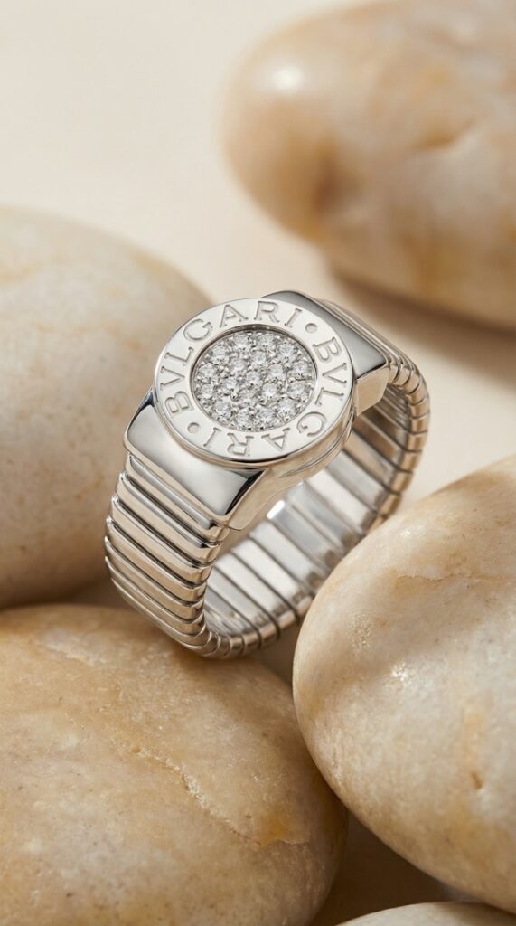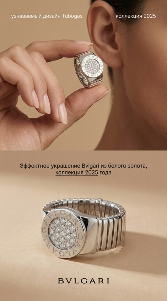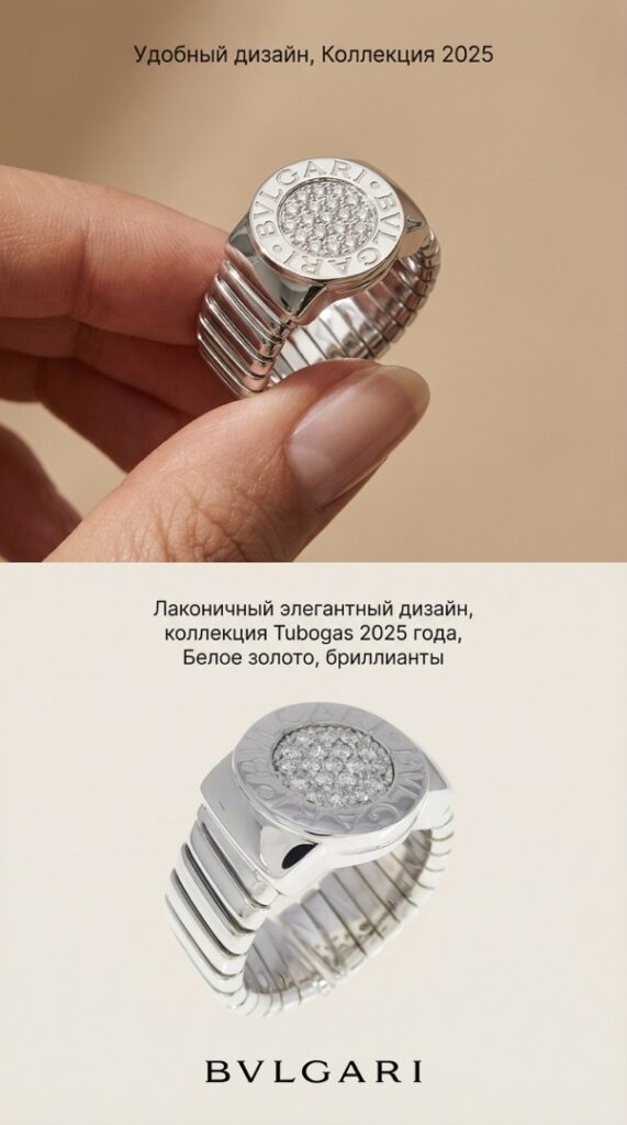 - Кольцо Bvlgari Tubogas — эффектное украшение из белого золота с узнаваемым дизайном, сочетающим гибкость формы и современную роскошь.