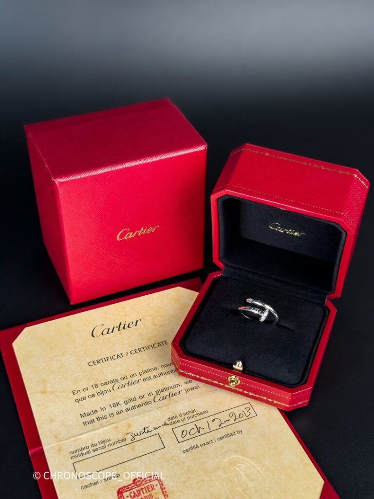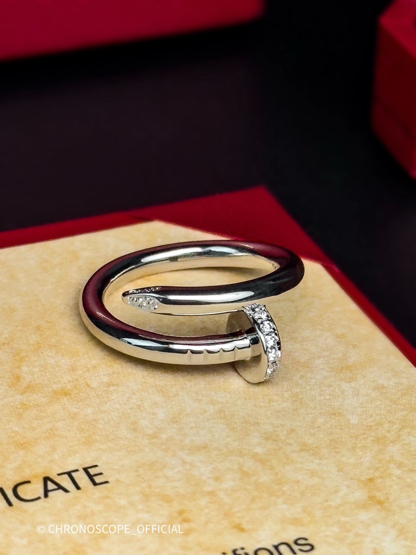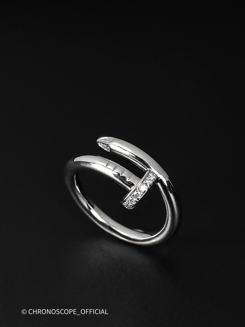 - Выполненное из благородного белого золота 18 карат, кольцо Juste un Clou сияет прохладным, аристократическим блеском, подчеркивая чистоту линий и лаконичность дизайна. Его форма, вдохновленная простым гвоздем, превращена в изысканный предмет искусства, демонстрирующий мастерство ювелиров Cartier.