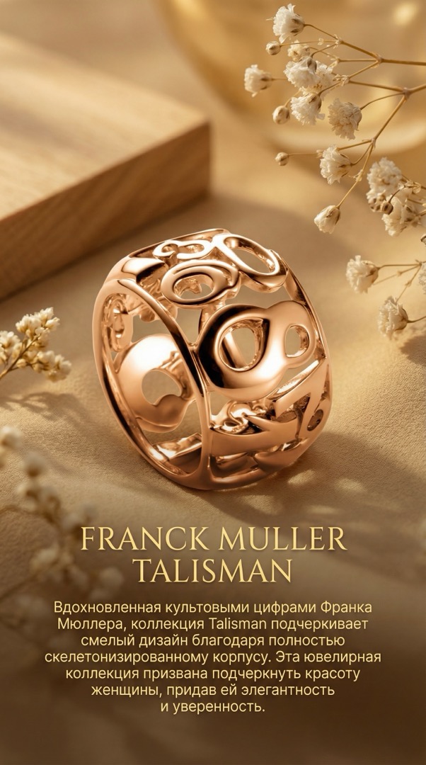 - Вдохновленная культовыми цифрами Франка Мюллера, коллекция Talisman подчеркивает смелый дизайн благодаря полностью скелетонизированному корпусу.