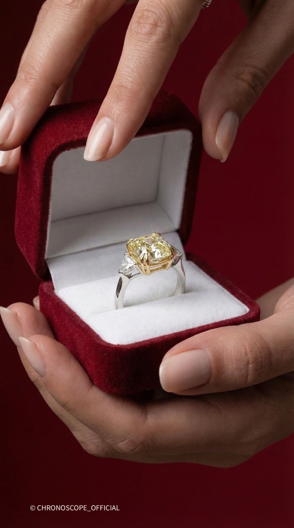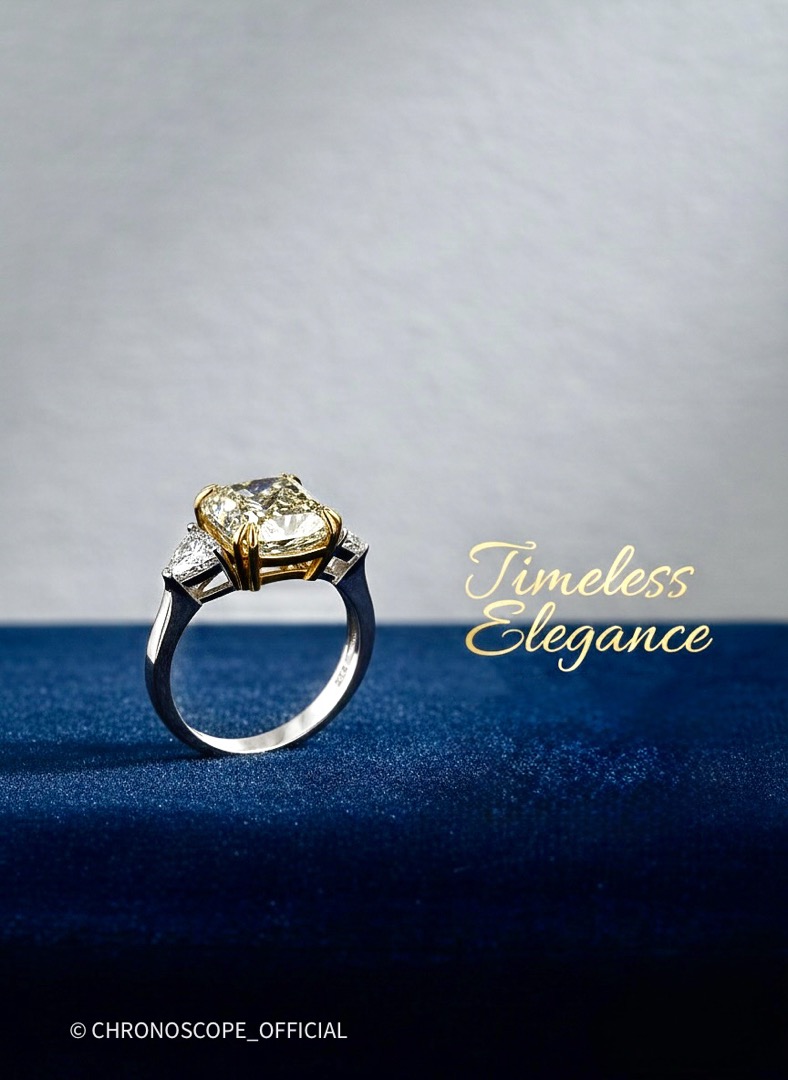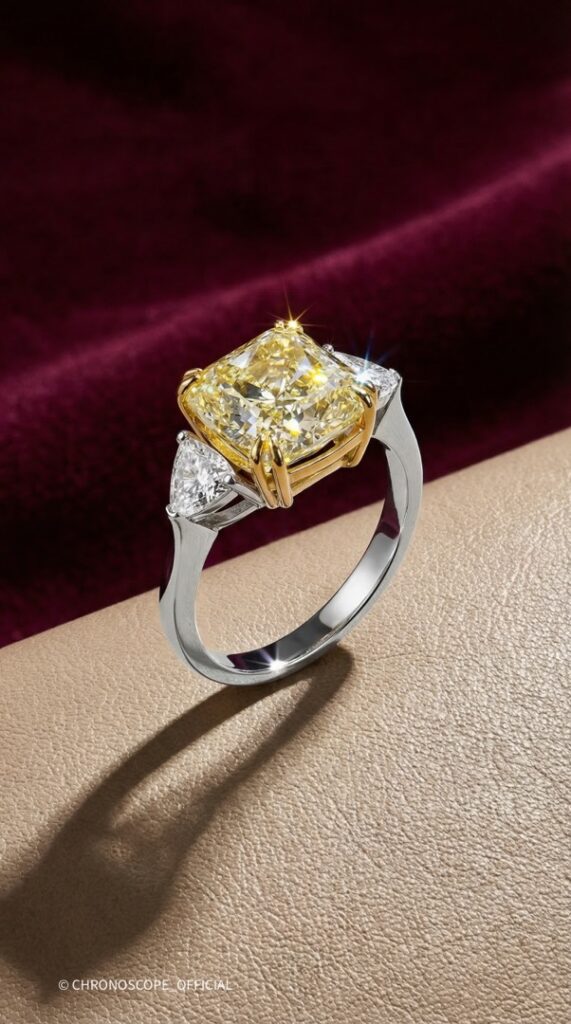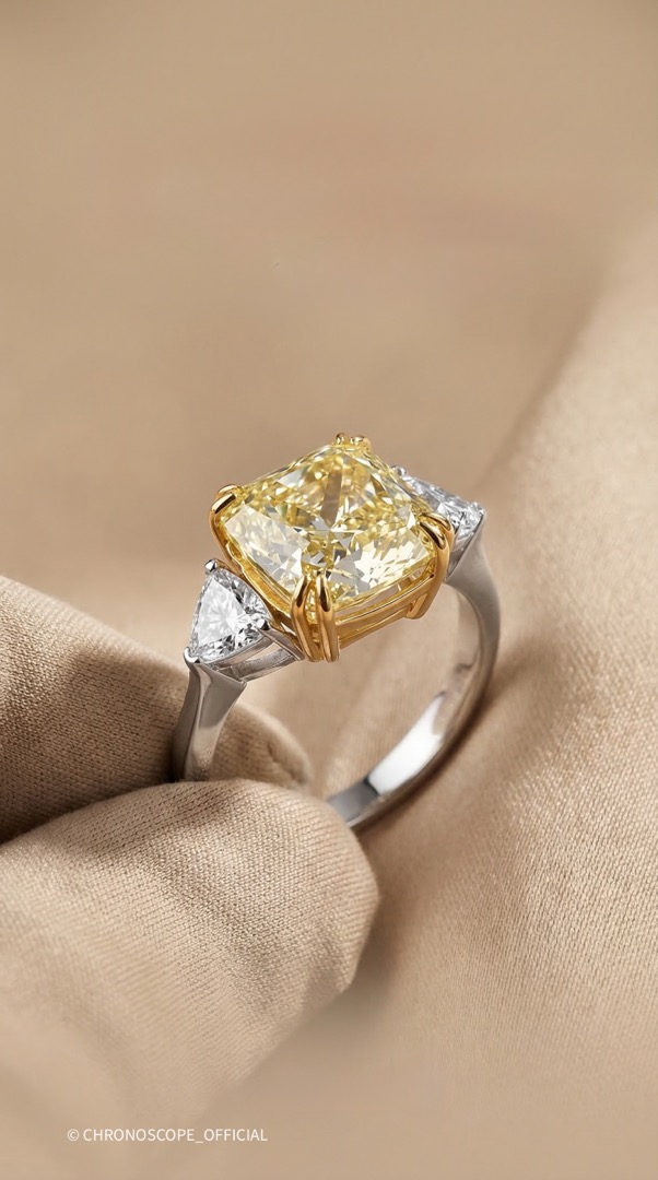 - Окружают центральный бриллиант два боковых бриллианта огранки триллион, каждый весом 0.75 карата и с характеристиками 5/5. Их треугольная форма идеально дополняет центральный камень, создавая гармоничную и сбалансированную композицию. Боковые бриллианты добавляют кольцу дополнительное сияние и подчеркивают ослепительный блеск жёлтого бриллианта.