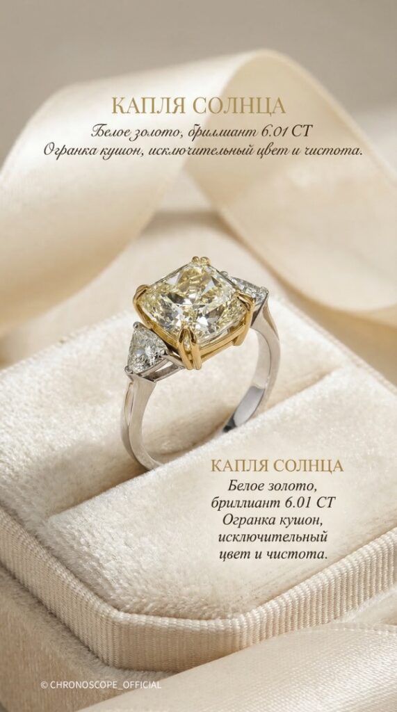 - Представляем вашему вниманию великолепное кольцо, воплощающее в себе саму суть роскоши и изысканности. В центре этого ювелирного шедевра – редчайший природный жёлтый бриллиант весом 6.01 карата, обладающий восхитительным оттенком от Y до Z и безупречной чистотой VS1. Этот бриллиант – настоящее сокровище, сияющее завораживающим светом и притягивающее взгляды своей уникальной красотой.