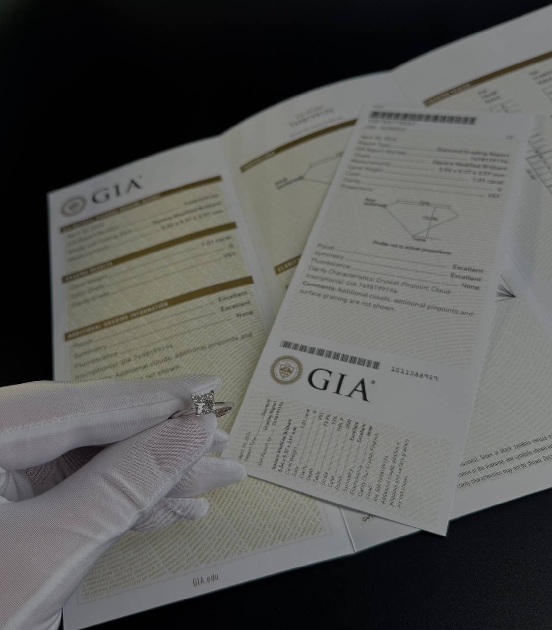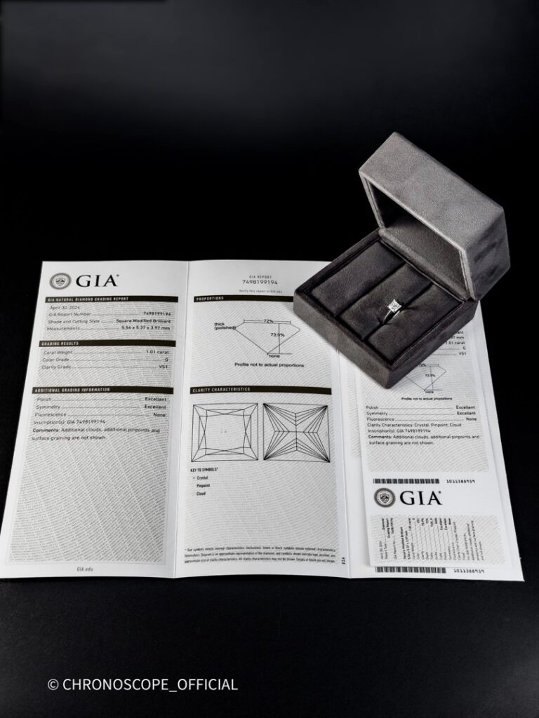 - Принцесса 1.01 ct G/VS1 – бриллиант огранки «Принцесса», весом в 1.01 карата, цвета G и чистоты VS1.