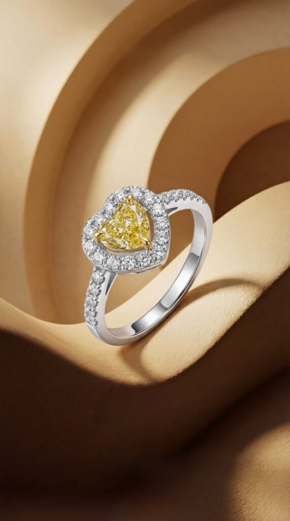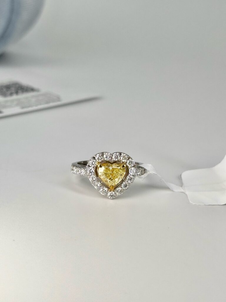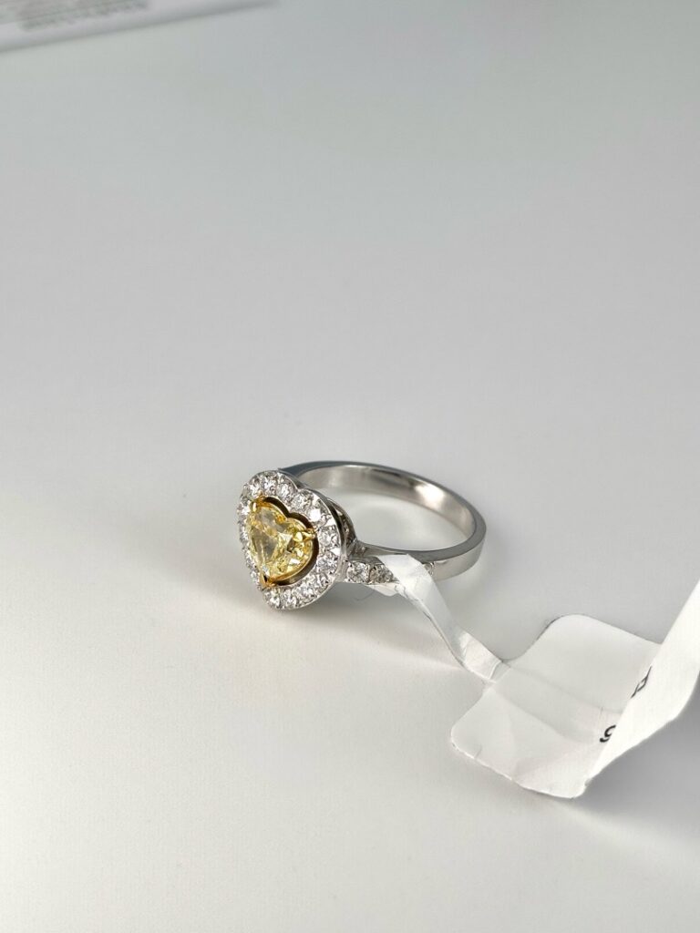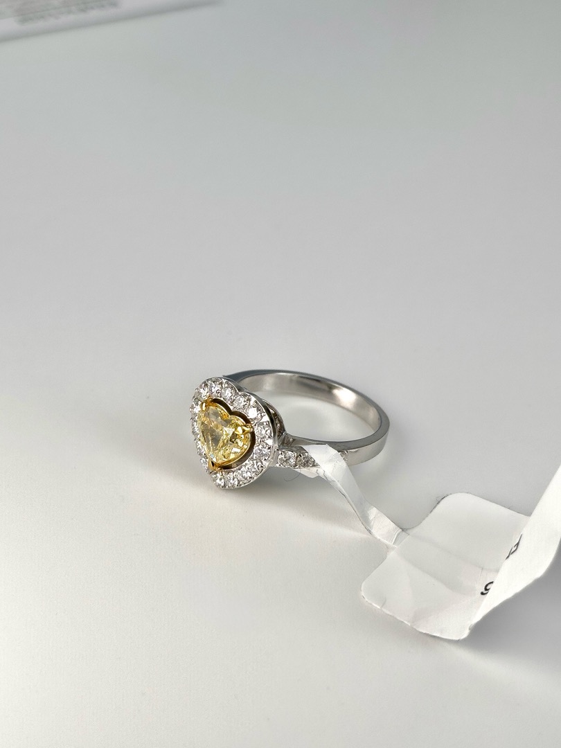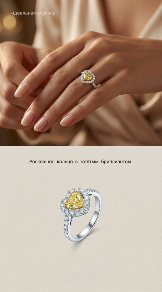 - Элегантное кольцо с редким фантазийным жёлтым бриллиантом, дополненное россыпью сверкающих камней. Белое золото 18K подчёркивает яркость и чистоту бриллиантов, создавая утончённый и статусный образ. Украшение, которое притягивает внимание и остаётся актуальным вне времени.