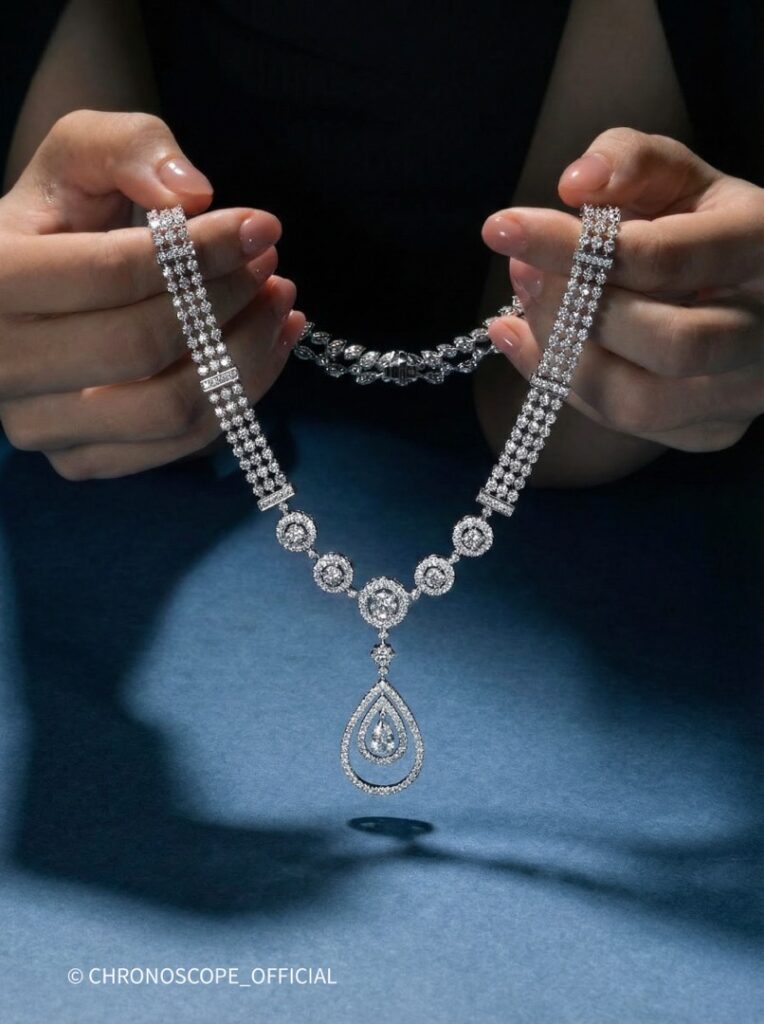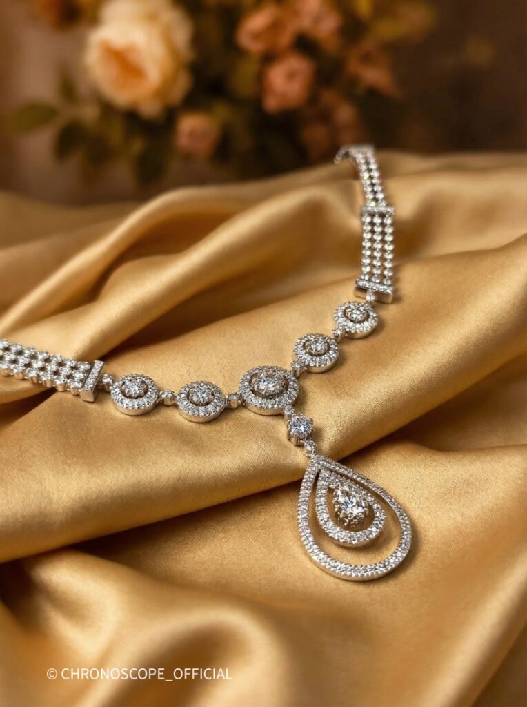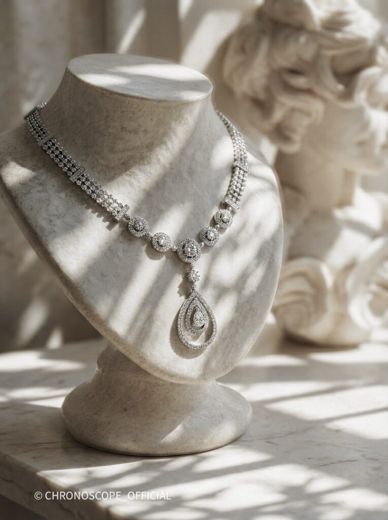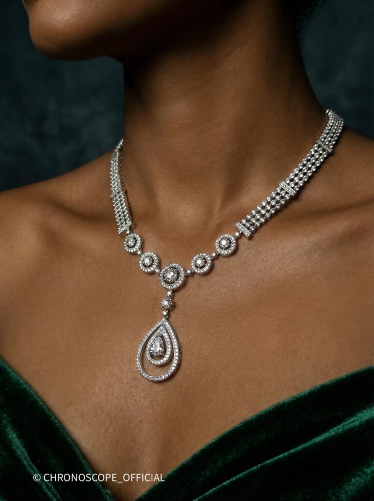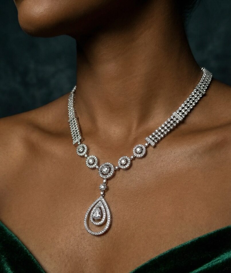 - Изысканное колье, выполненное из благородного белого золота, станет воплощением вашей утонченности и безупречного вкуса.