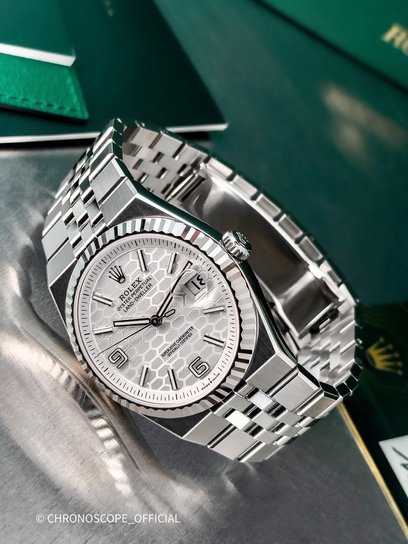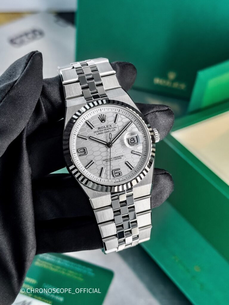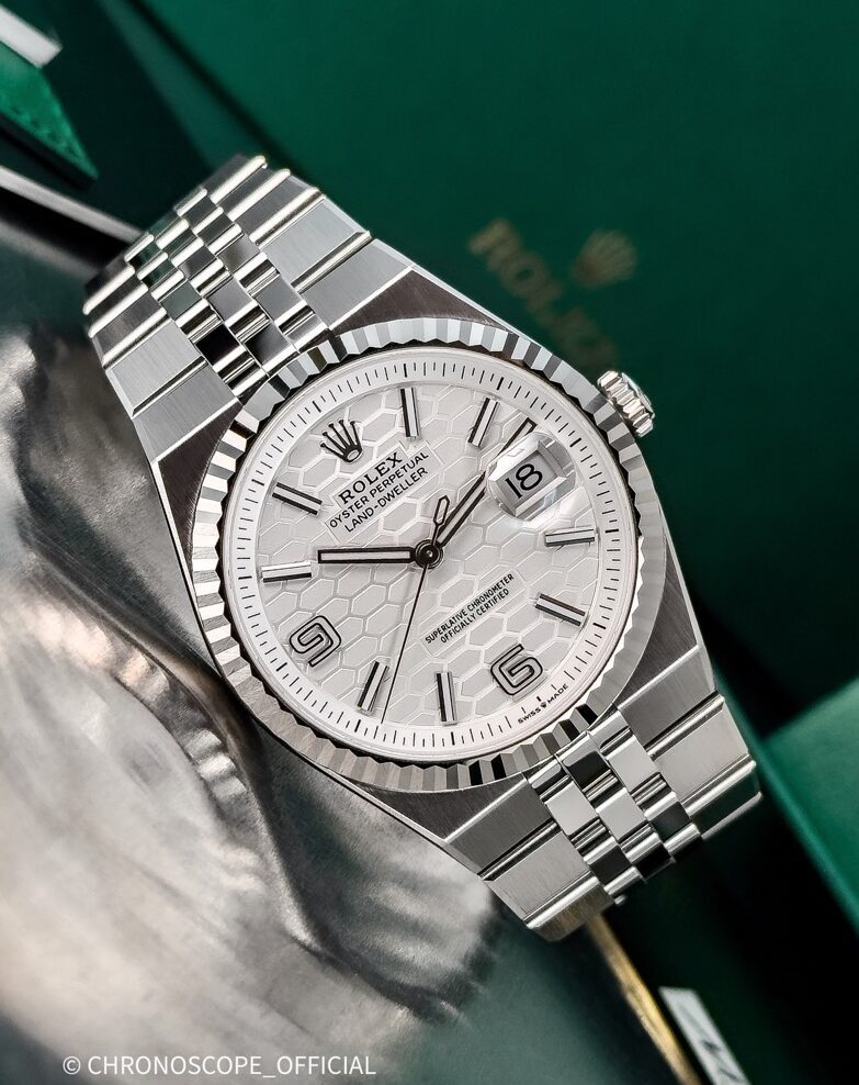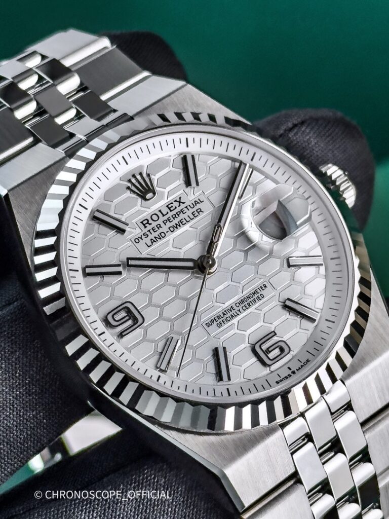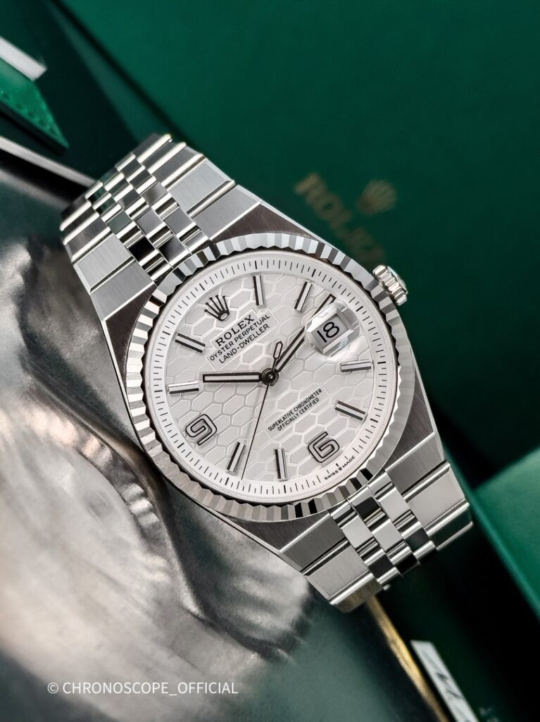 Модель Land-Dweller, доступная в белом цвете Rolesor отличается характерным узором в виде пчелиных сот на циферблате, эксклюзивными элементами индикации и новым корпусом Oyster в сочетании с браслетом Flat Jubilee.