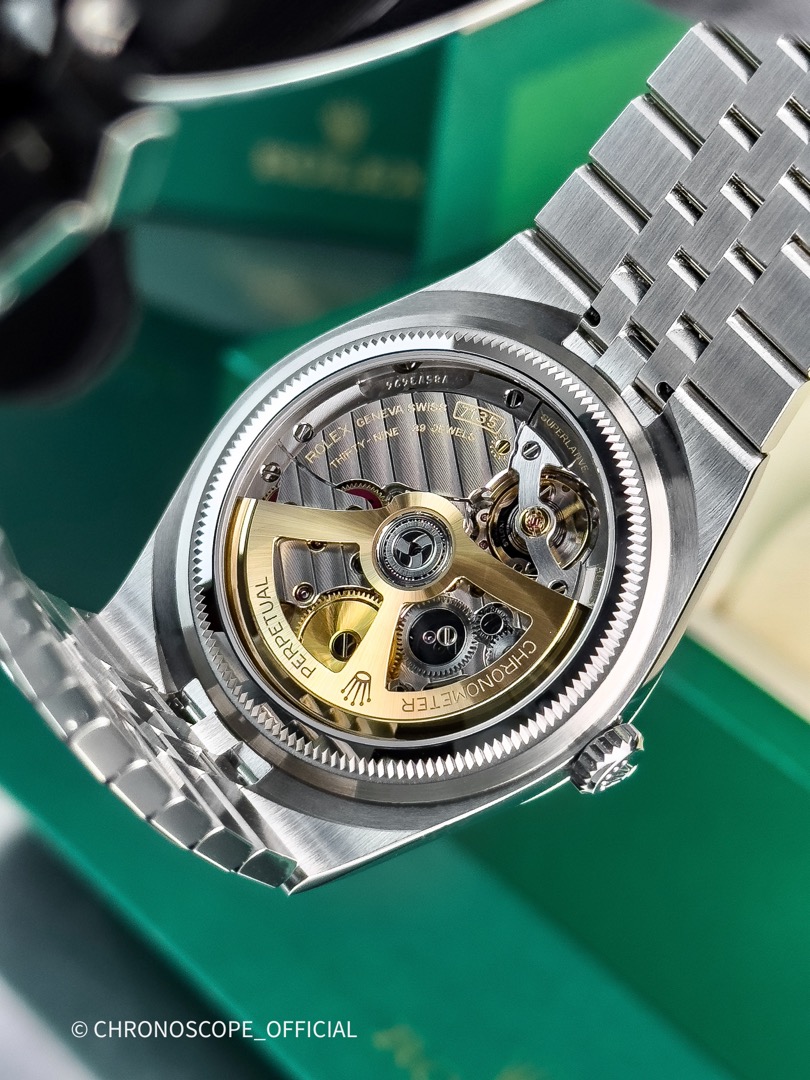 Сквозь прозрачную заднюю крышку часов можно увидеть блеск вырезанного колеблющегося груза из желтого золота, а также изящную отделку Rolex Côtes de Genève на мостах.