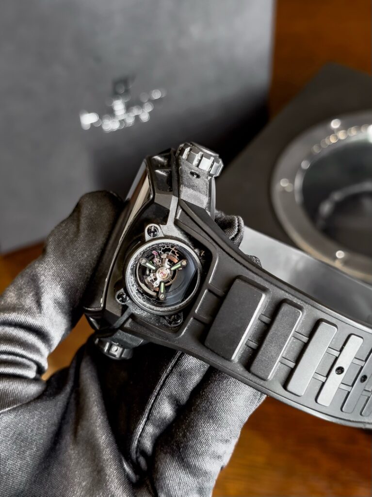 Циферблат закрыт прозрачным антибликовым стеклом из сапфирового хрусталя высокой прочности, благодаря чему обеспечивается максимальная защита от сколов и механических повреждений. Ремешок из каучука с раскладывающейся титановой застежкой превосходно дополняет изысканный образ модели. Ограниченная серия (Limited Edition) 50 шт. Tourbillon. Запас хода до 96 часов.