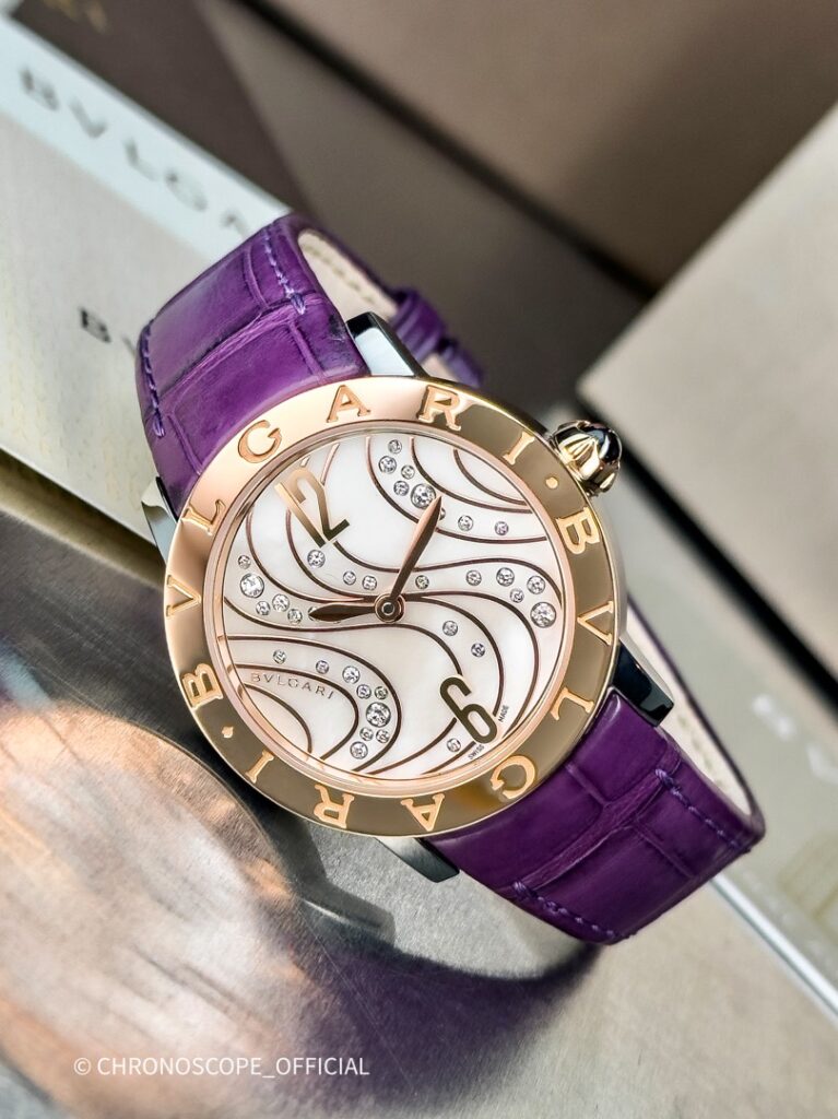 Яркая женская модель с перламутровым циферблатом и бриллиантами на фиолетовом кожаном ремешке.