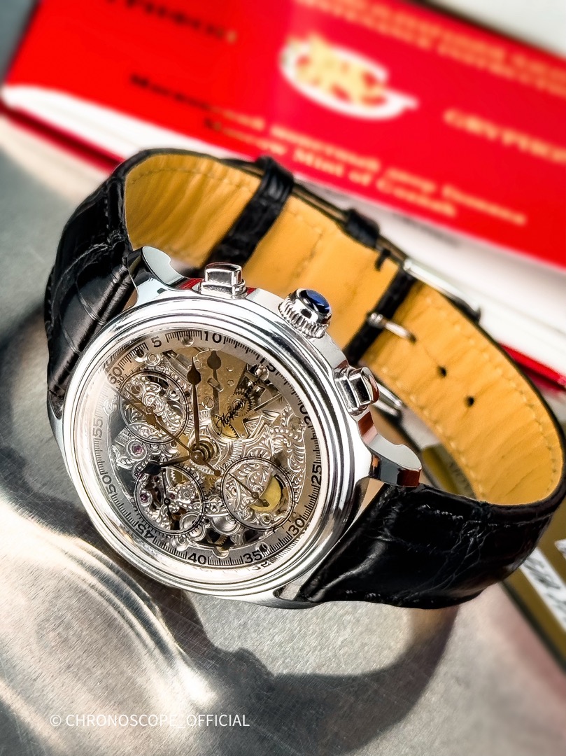 Уникальные часы от Московского монетного двора. Выполнены в корпусе из золота 750 пробы в технике «скелетон» что открывает вид на красиво оформленный швейцарский механизм.