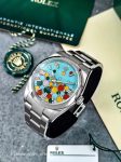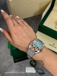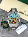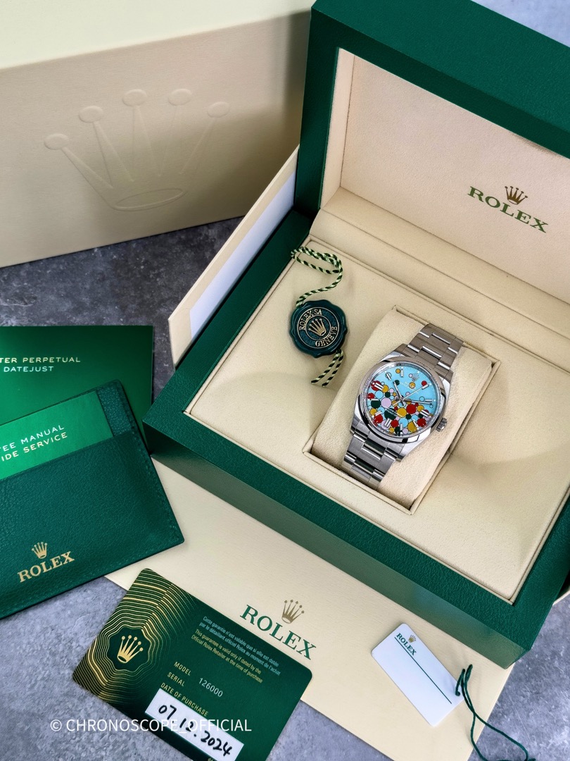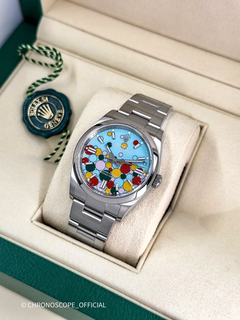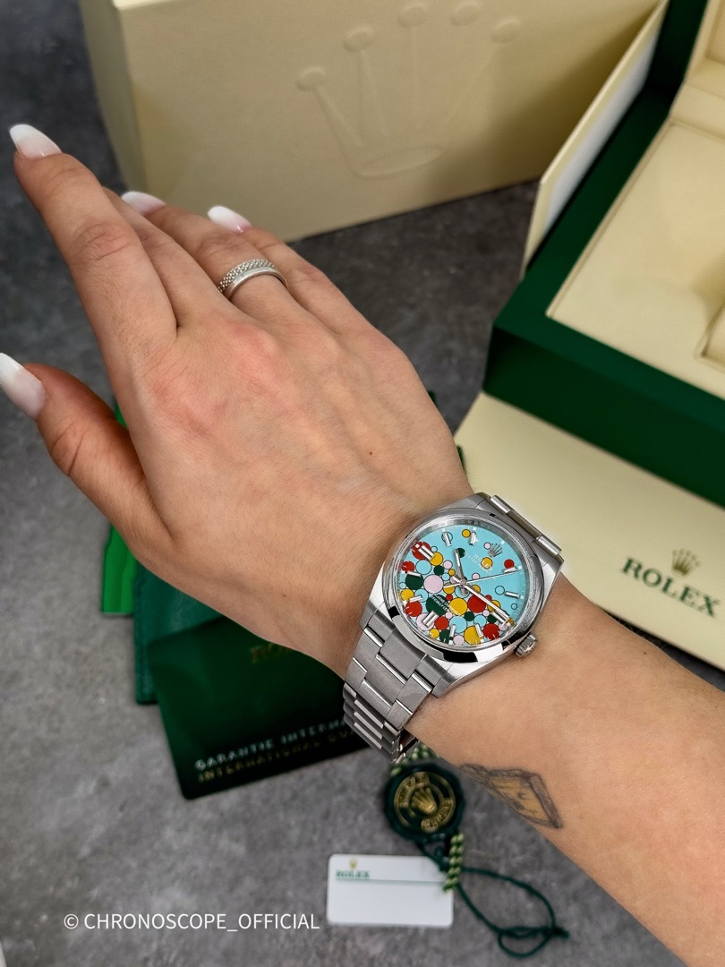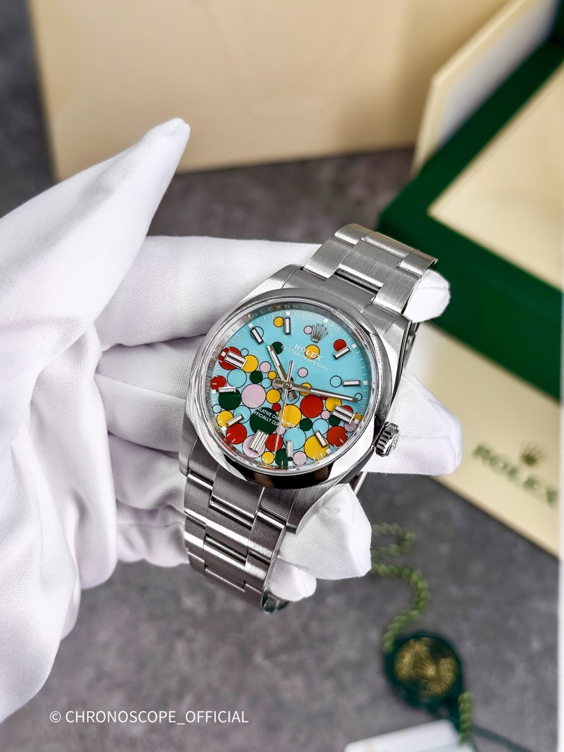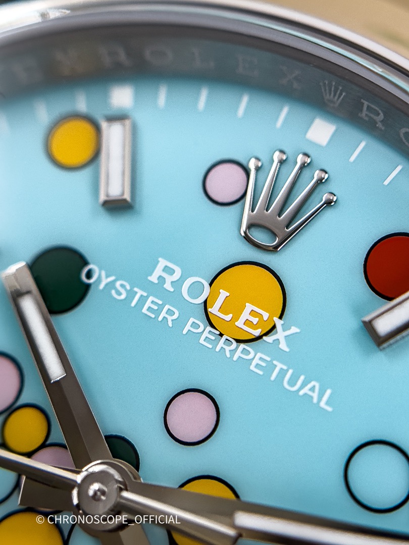 Эта новая версия Rolex Oyster Perpetual представлена на бирюзово-синем циферблате, украшенном 51 цветным пузырем, окруженным тонкой черной каймой – праздничная атмосфера, благодаря которой часы получили свое декоративное название Célébration . При выборе тонов компания Rolex обратилась к циферблатам линейки Oyster Perpetual, представленной в сентябре 2020 года, сохранив только пять – в данном случае самых ярких: конфетно-розовый, бирюзово-синий, желтый, кораллово-красный и зеленый.