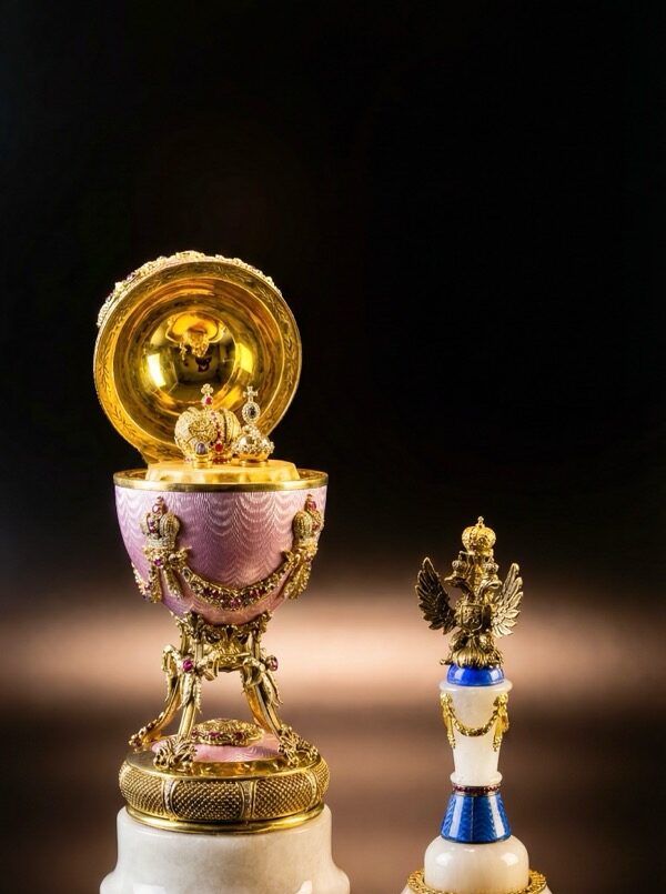 - Дорогие друзья, у нас в наличии коллекционный лот, который сегодня вряд ли удастся найти даже на международных аукционах — ювелирная композиция в стиле Карла Фаберже в виде пасхального яйца «Символы Власти» и печати в форме стеллы, увенчанной двуглавым орлом