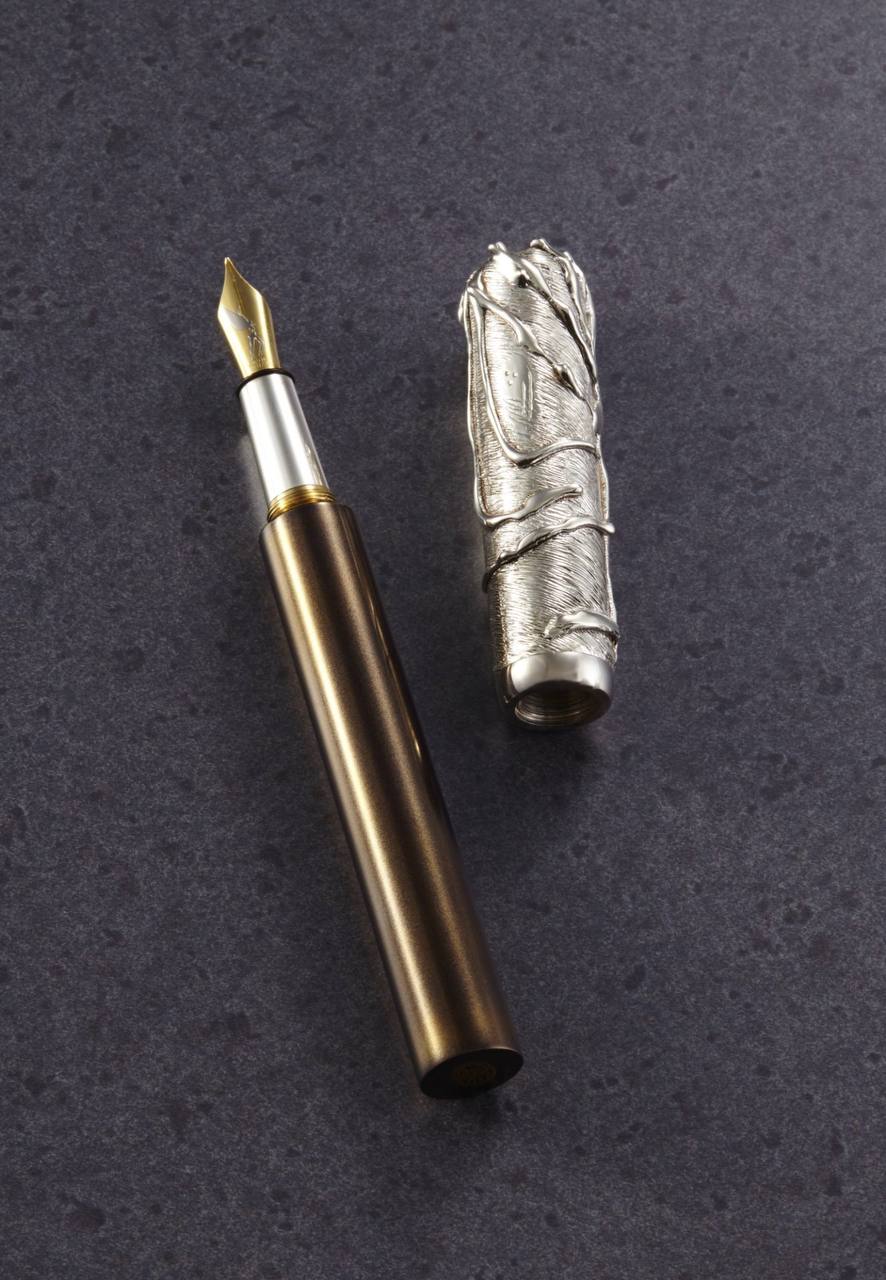 Ручка имеет уникальный дизайн с текстурированным колпачком, напоминающим кору дерева или скальную породу, стерлинговое серебро 925.