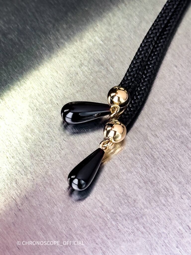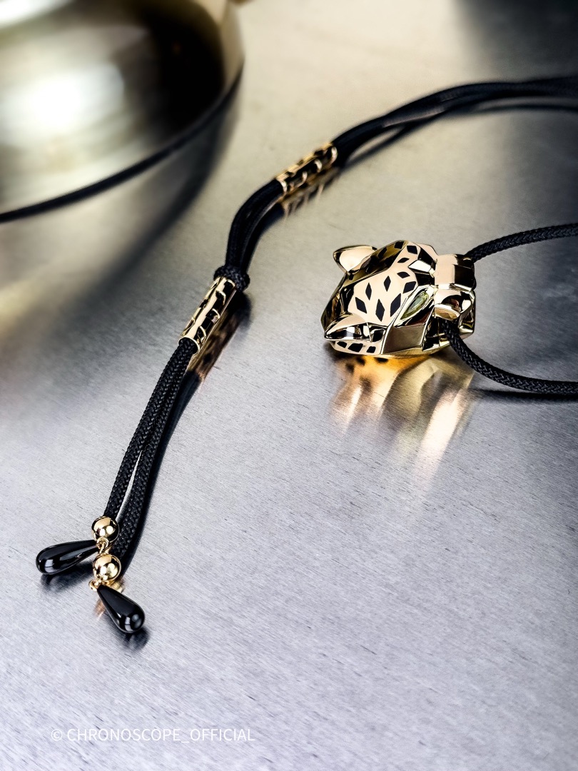 - Колье Cartier Panthere de Cartier из 18-каратного жёлтого золота и шёлкового шнура с резным ониксом, грушевидным хризолитом и эмалевыми деталями, с регулируемой застёжкой.