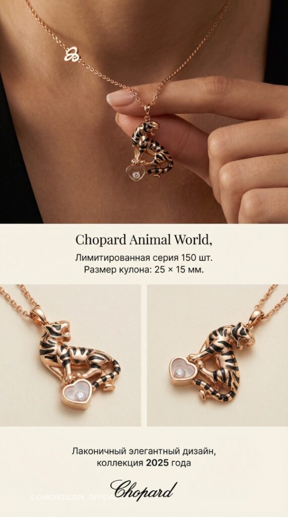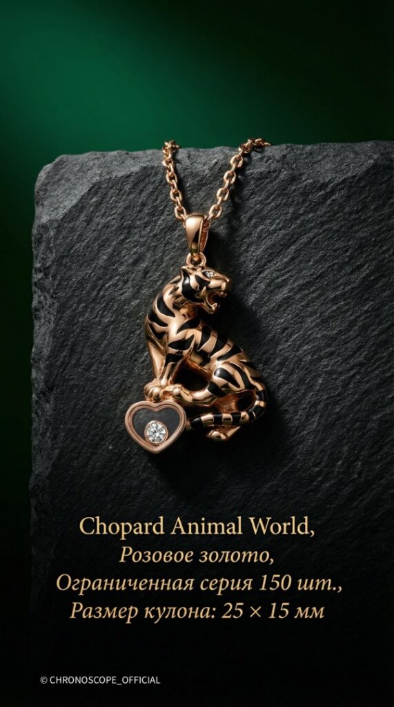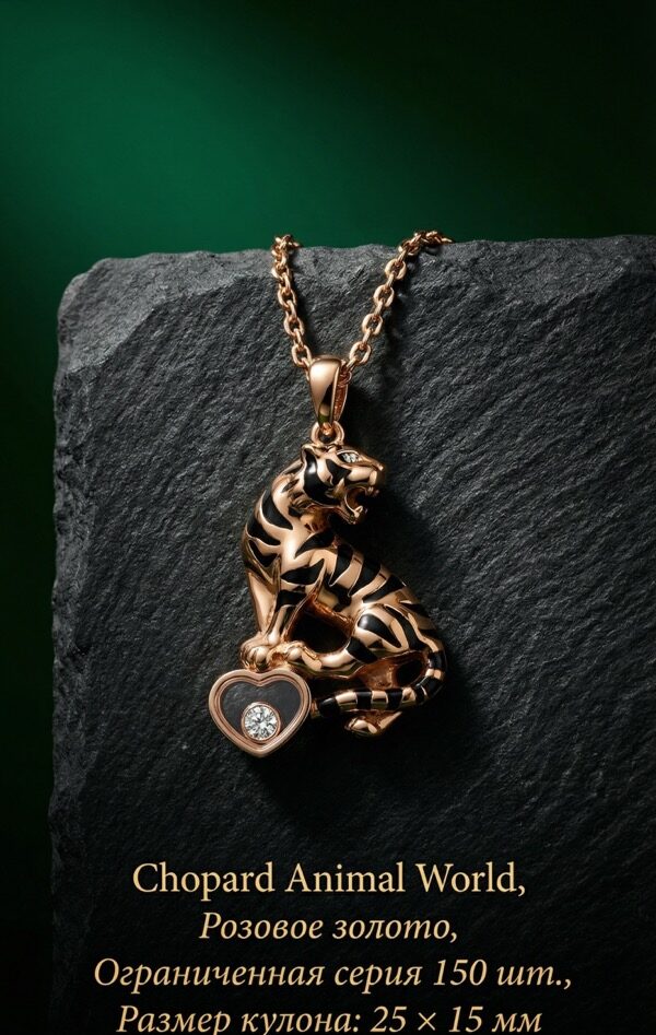 - Подвеска Chopard Animal World — изысканное украшение из розового золота с эффектным «плавающим» бриллиантом, подчёркивающее индивидуальность и статус.