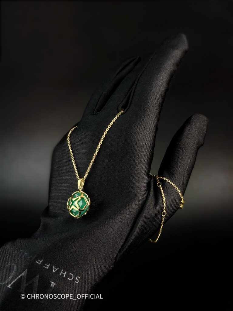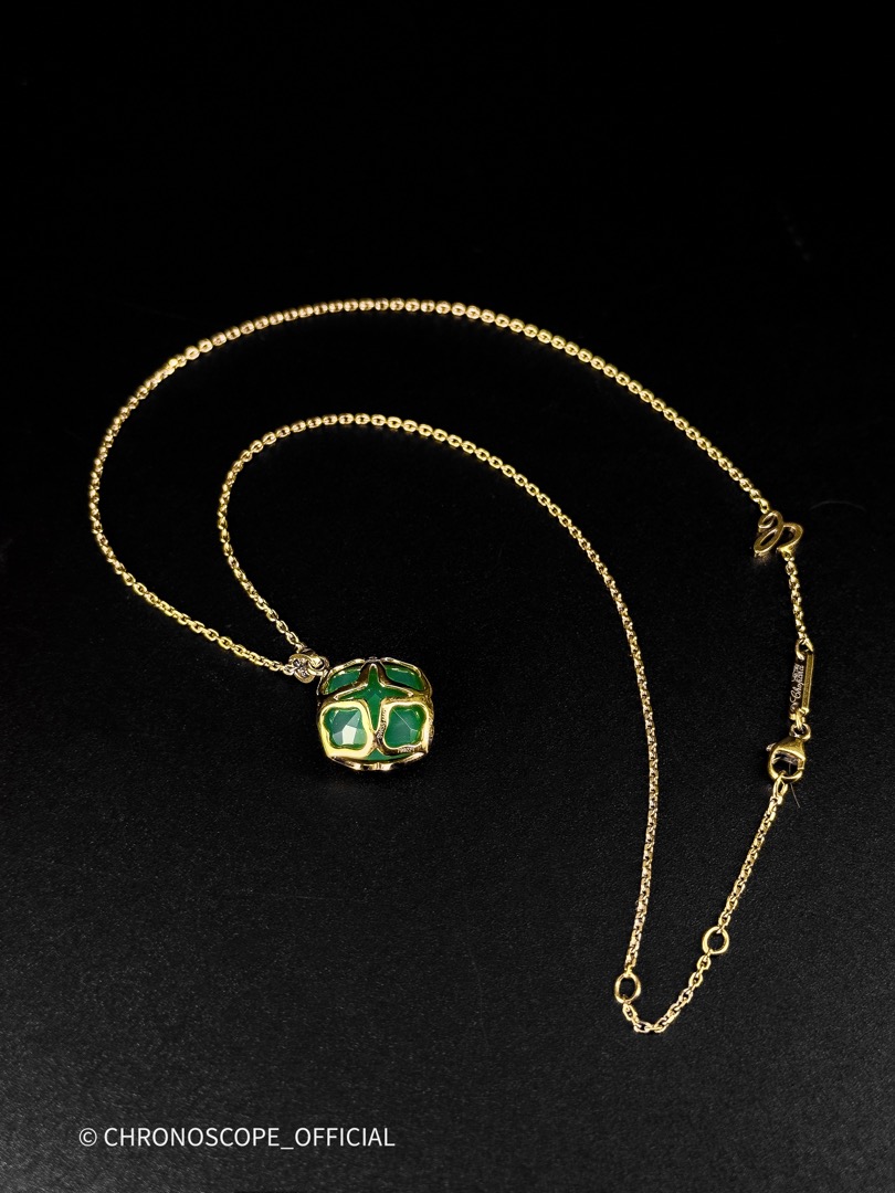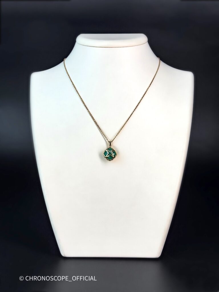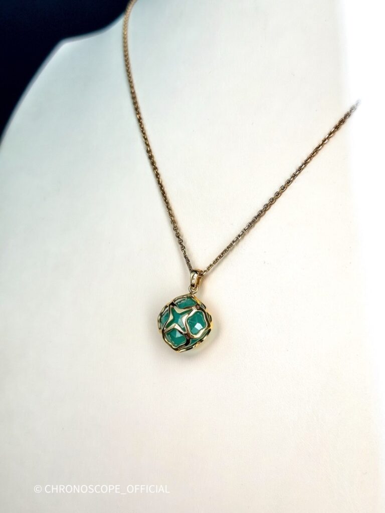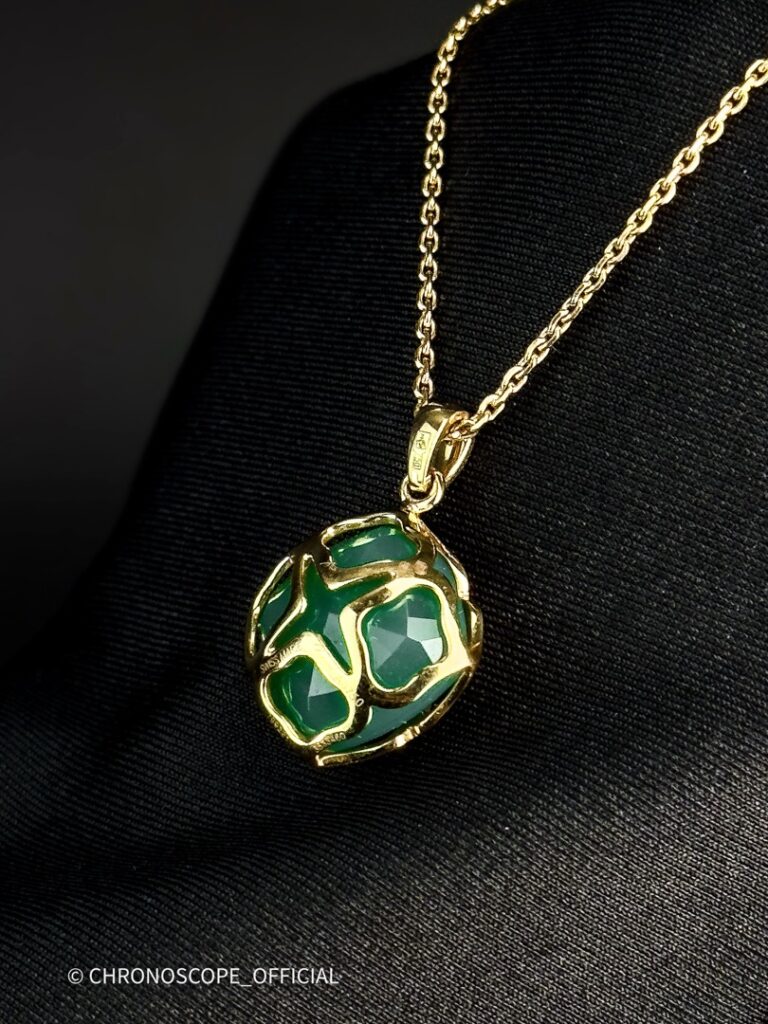 - Розовое золото 18 карат , дарит кулону теплое, нежное сияние. Этот благородный металл идеально подчеркивает глубину и насыщенность цвета зеленого халцедона.