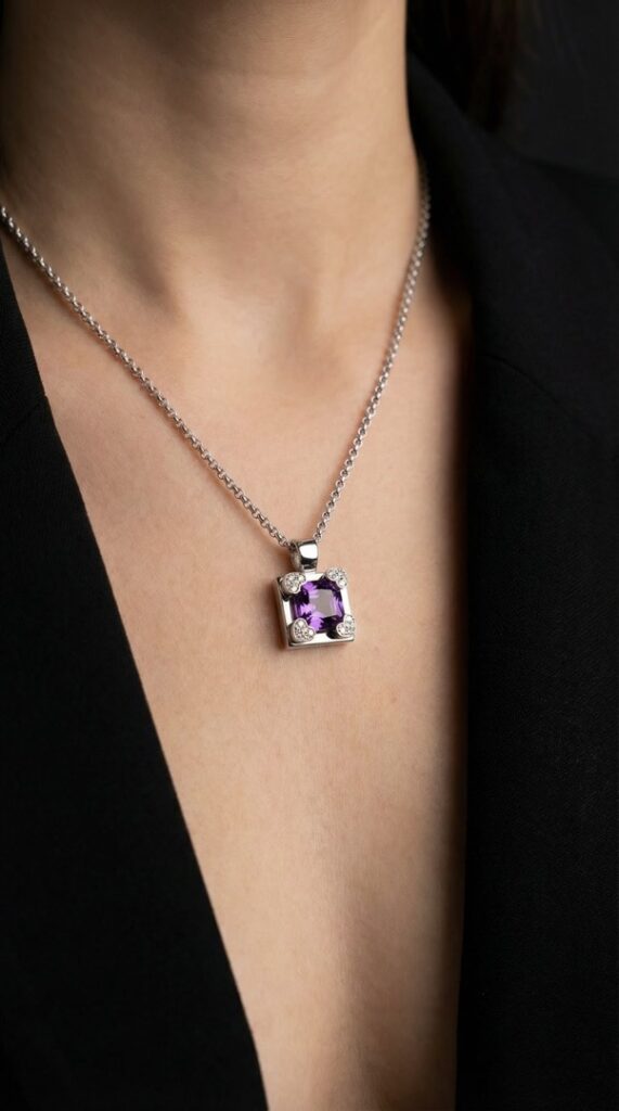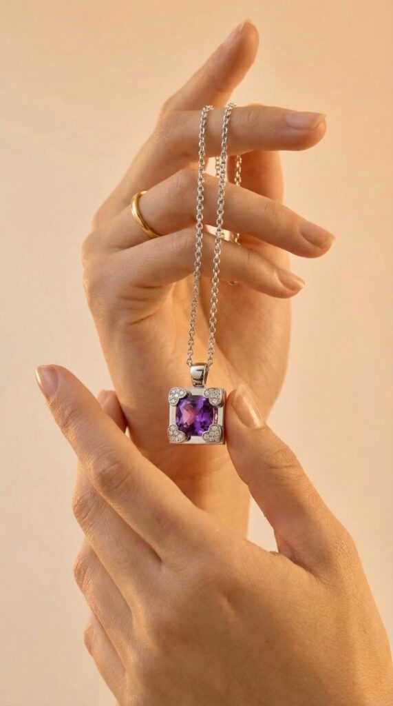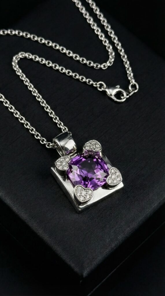 - Бриллианты, словно маленькие звезды, подчеркивают красоту аметиста, добавляя подвеске дополнительный блеск и роскошь. Их деликатное сияние создает неповторимую игру света, делая украшение еще более привлекательным и запоминающимся.