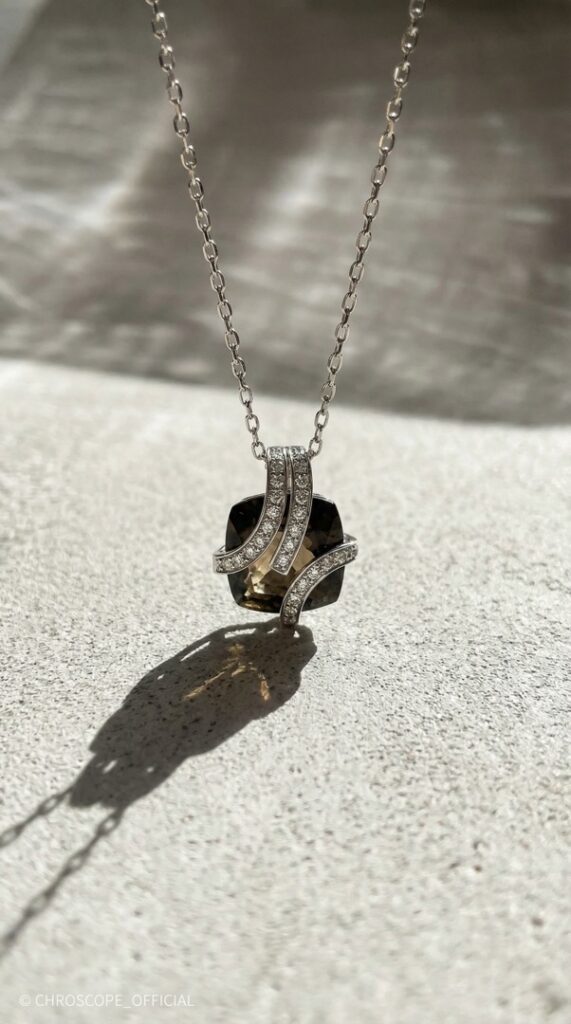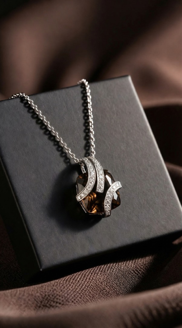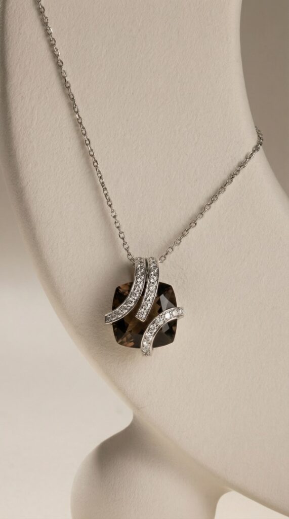 - Подвеска выполнена из белого золота 750 пробы с 26 белыми природными бриллиантами круглой огранки и 1 большим дымчатым кварцем.
