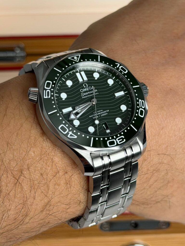 Эта модель диаметром 42 мм в корпусе из нержавеющей стали имеет зеленый керамический безель с дайверской шкалой из белой эмали. На циферблате из полированной зеленой керамики лазером выгравирован волнообразный узор, а в положении «6 часов» находится окошко указателя даты.