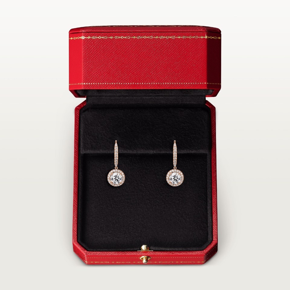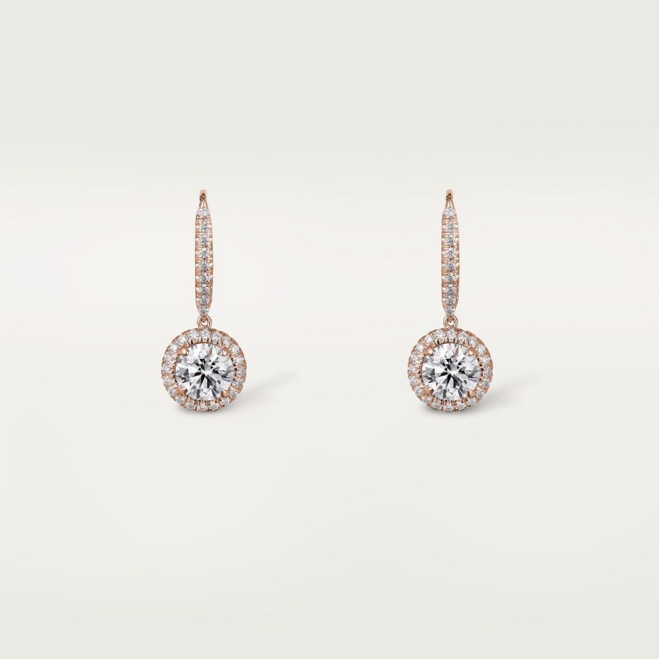 - Каждая серьга инкрустирована бриллиантом круглой огранки весом от 0,50 до 0,59 карата, от 1,00 до 1,15 карата или от 1,50 до 1,69 карата и украшена паве из бриллиантов круглой огранки.