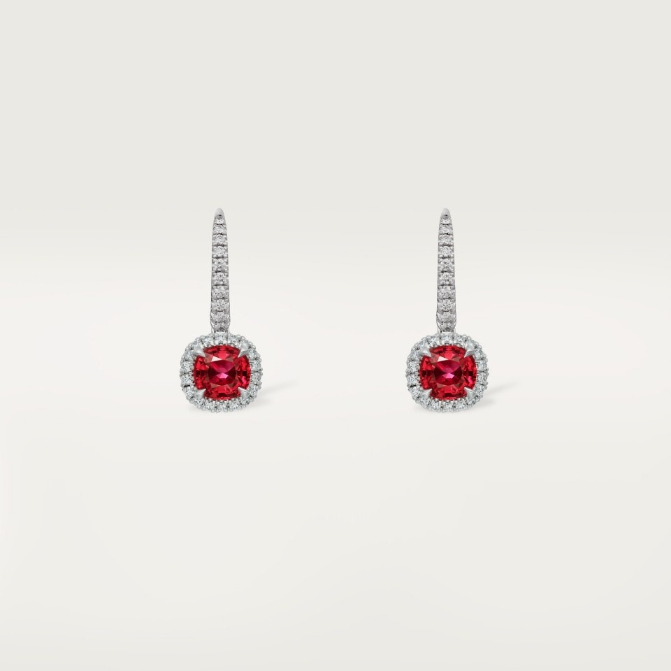- Каждая серьга инкрустирована рубином огранки «кушон» весом от 1,00 до 1,49 карата и украшена паве из бриллиантов круглой огранки.