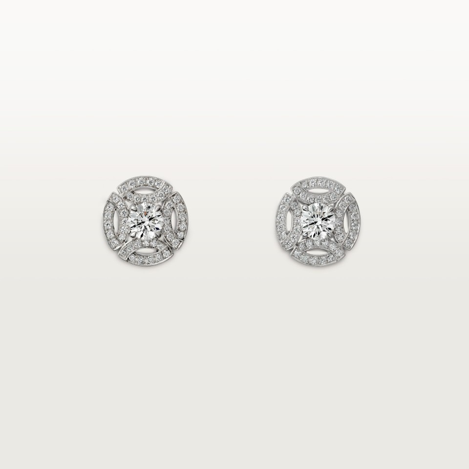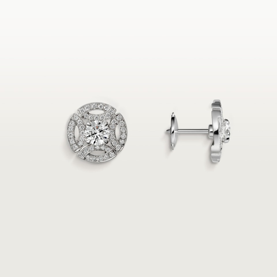 - Каждая серьга инкрустирована бриллиантом круглой огранки весом от 0,18 до 0,22 карата или от 0,40 до 0,44 карата и украшена паве из бриллиантов круглой огранки.
